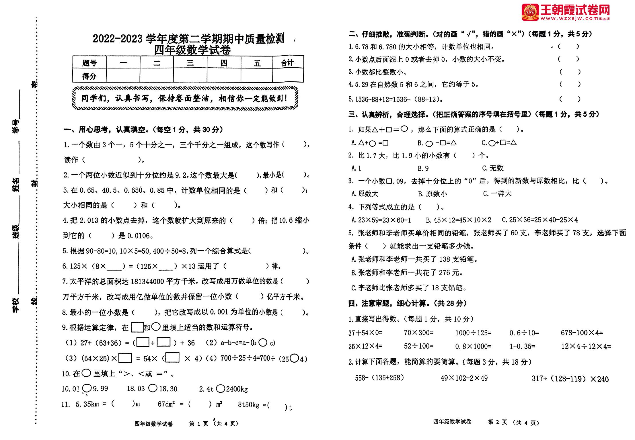 河北省秦皇岛市抚宁区2022-2023学年度第二学期期中质量检测试卷四年级数学(人教版)
