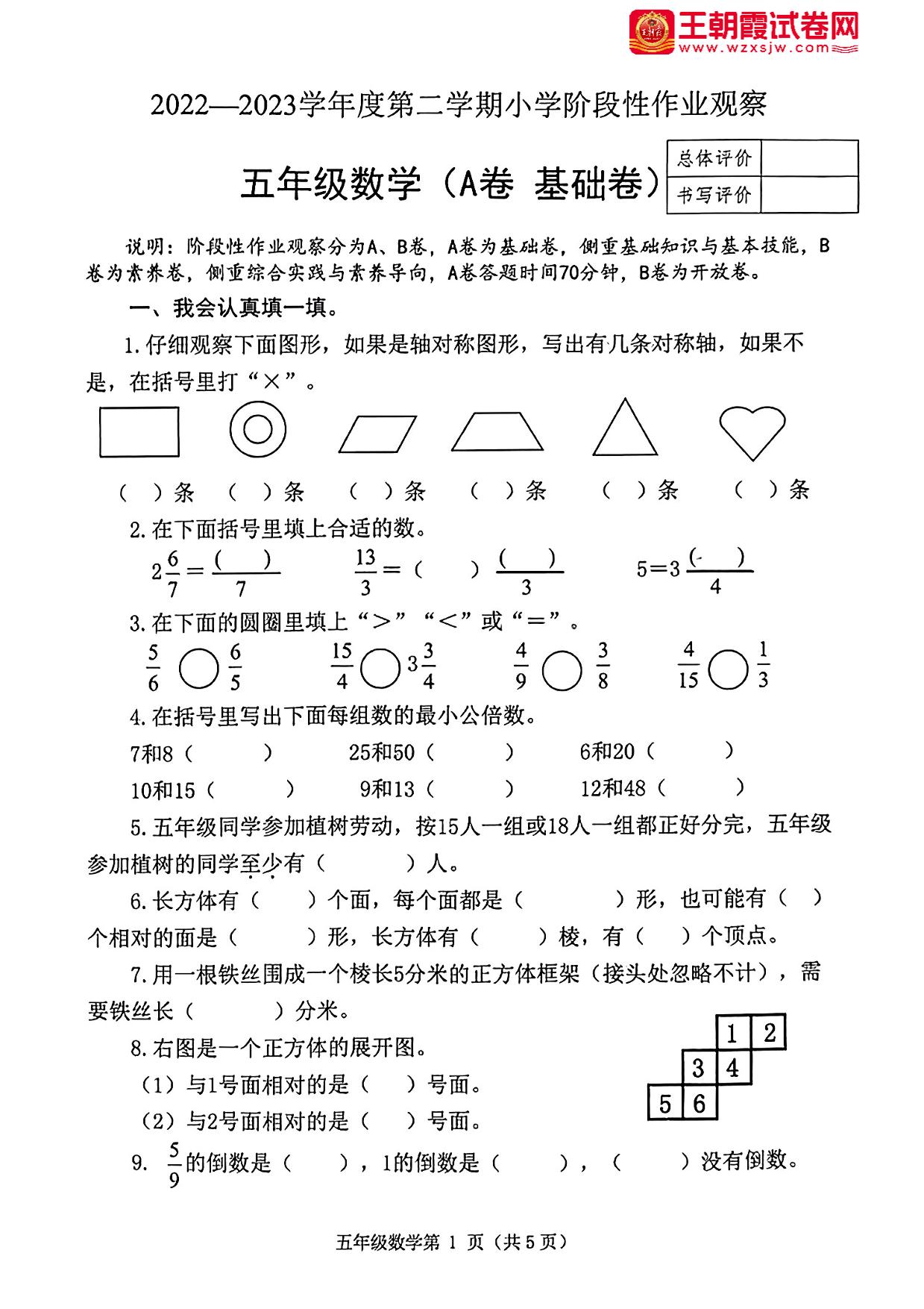 河北省唐山市迁安市2022-2023学年度第二学期期中阶段性作业观察五年级数学(冀教版)