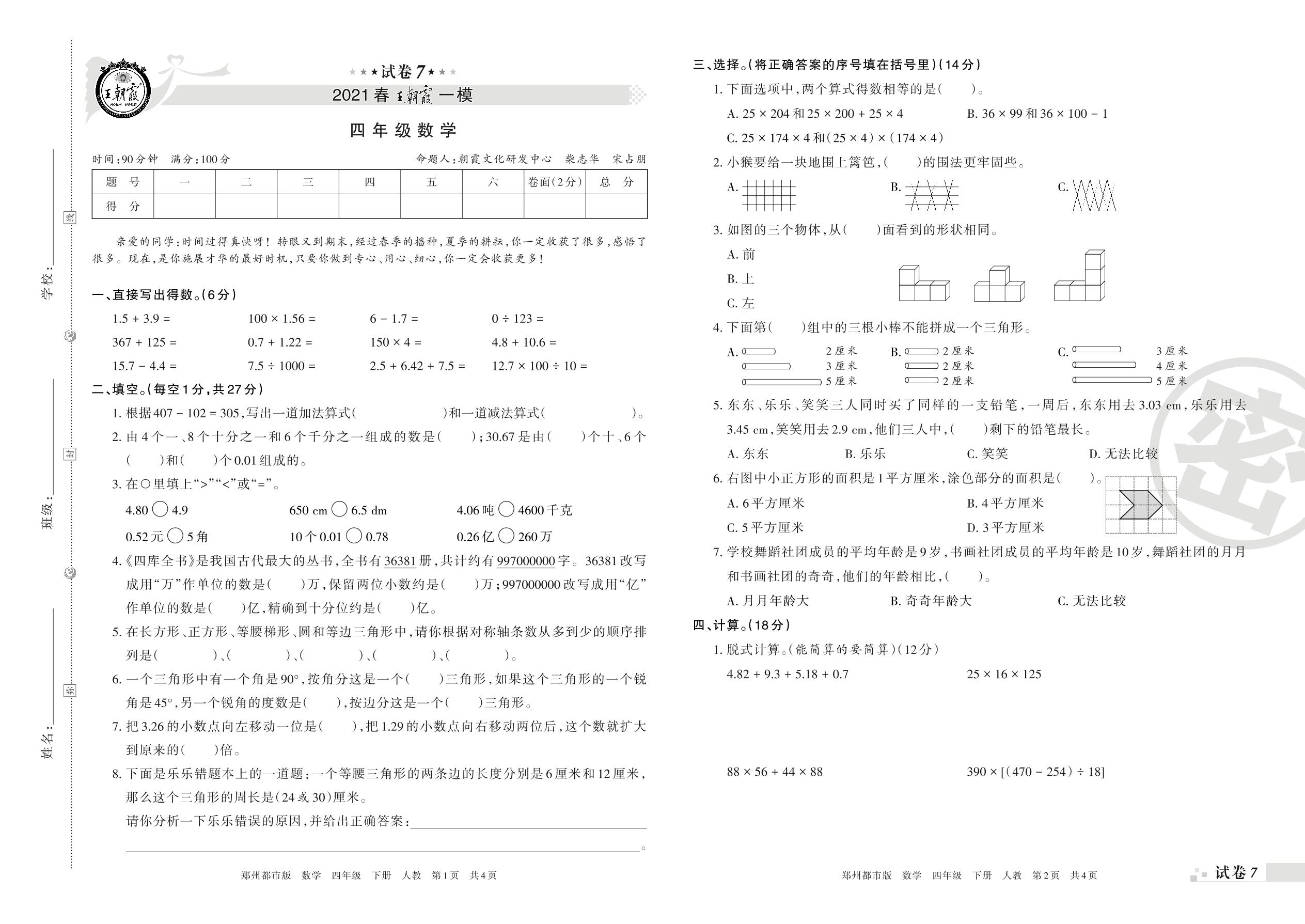 王朝霞期末模拟卷四年级下册数学(人教版)_R210804134012【7】