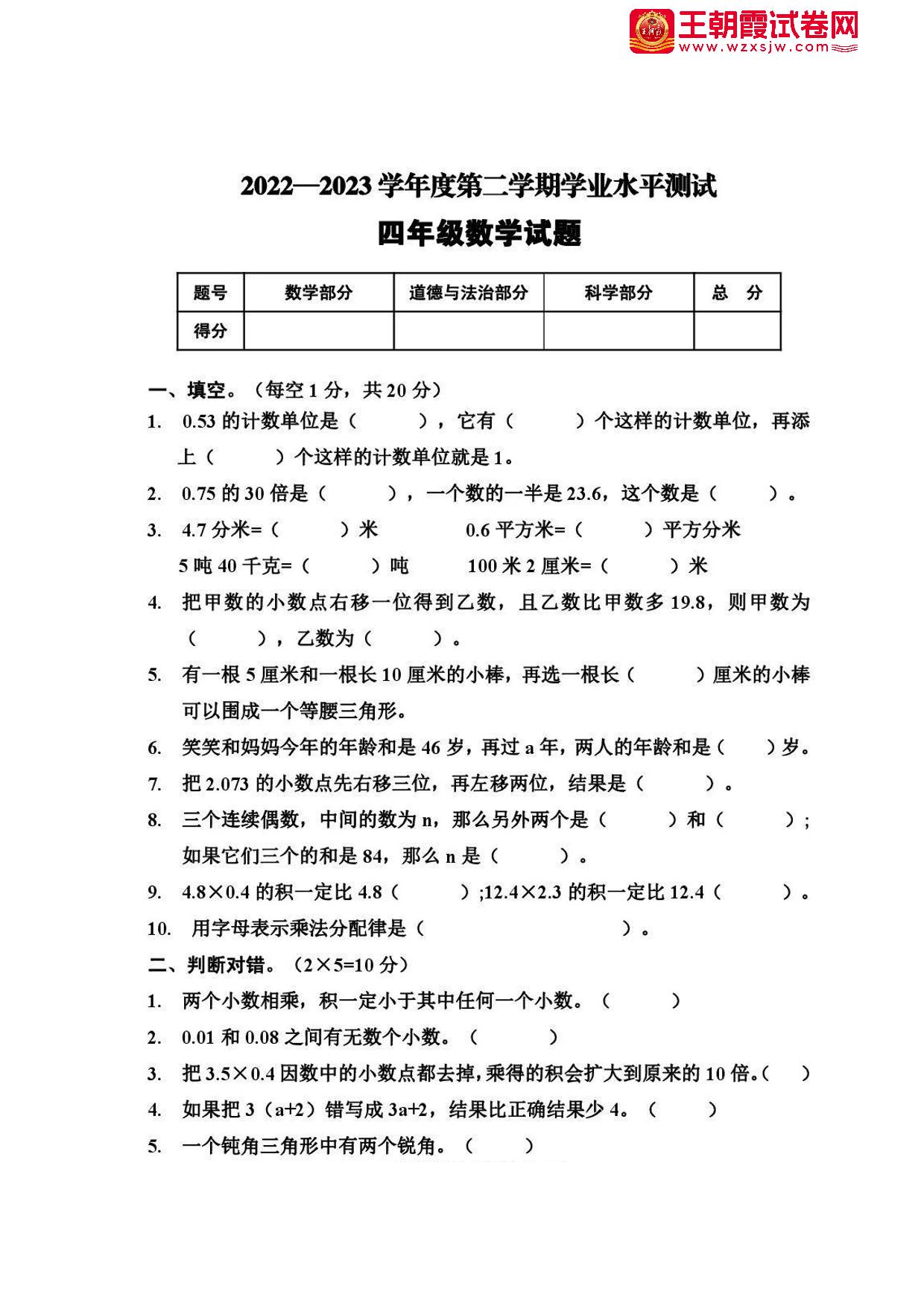 河南省驻马店市平舆县2022—2023学年下学期期中考试试题四年级数学(北师版)_R240318160911108