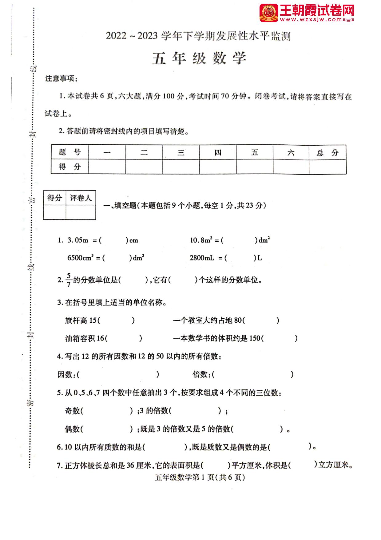 河南省漯河市舞阳县2022—2023学年下学期期中发展性水平监测试题五年级数学(人教版)