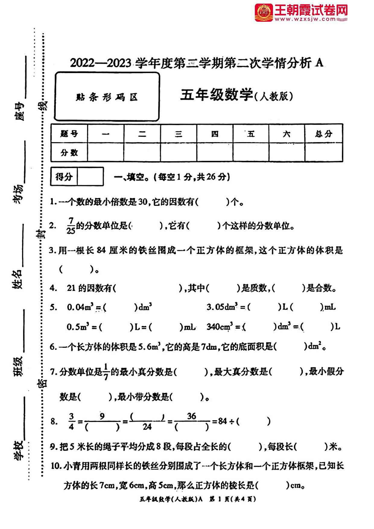 五年级数学人教版下册期中卷