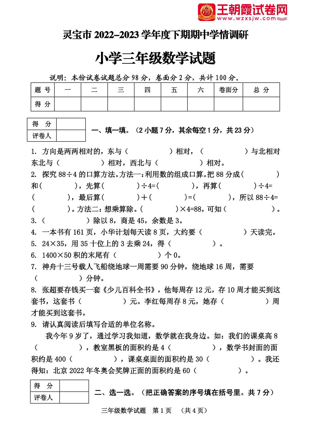 河南省三门峡市灵宝市2022—2023学年下学期期中学情调研试题三年级数学(人教版)