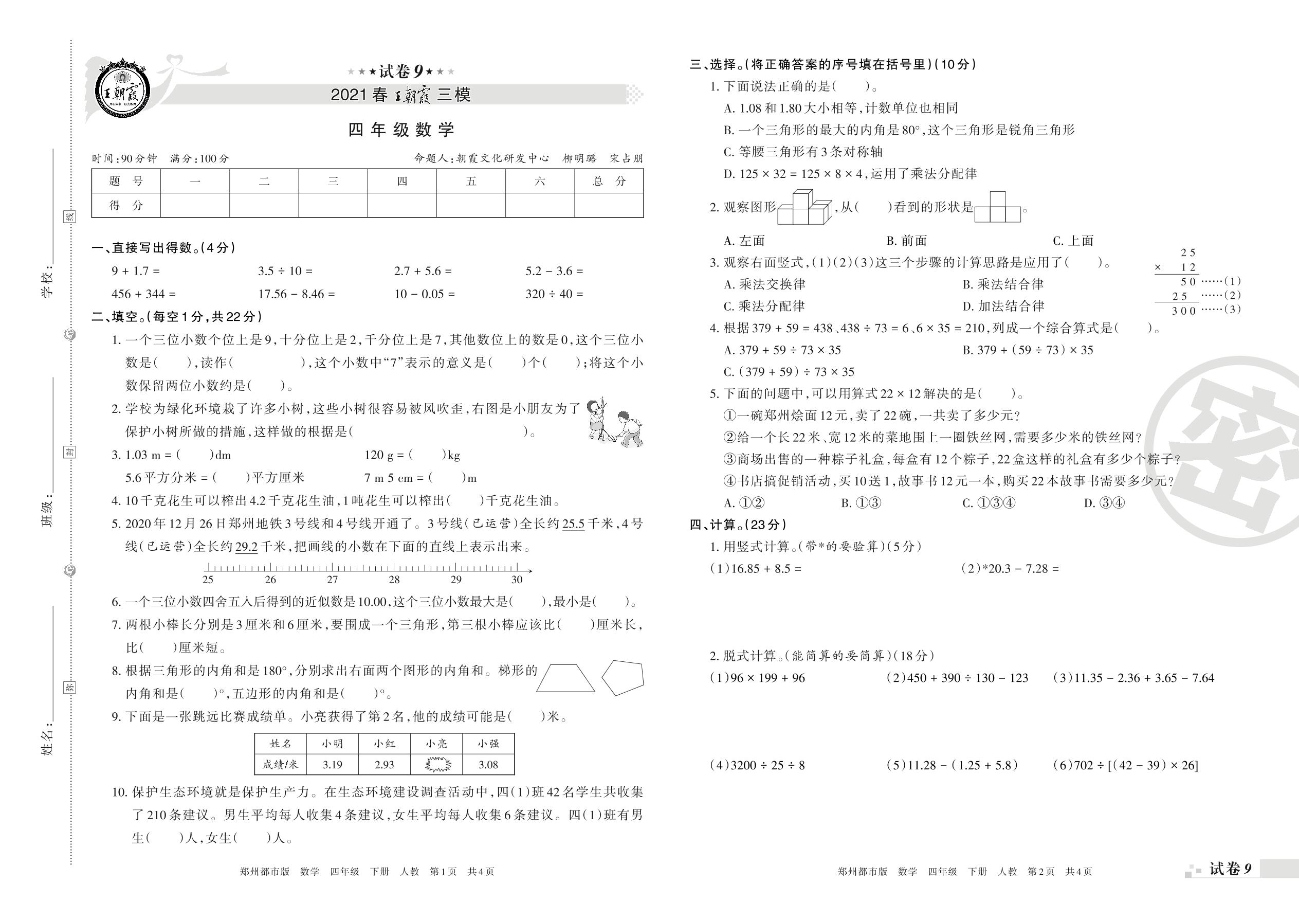 王朝霞期末模拟卷四年级下册数学(人教版)_R210804134021【9】