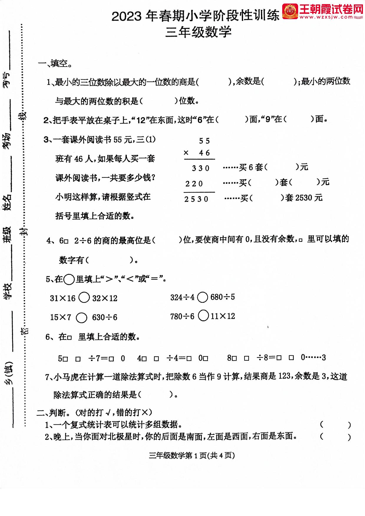 三年级数学人教版下册期中卷