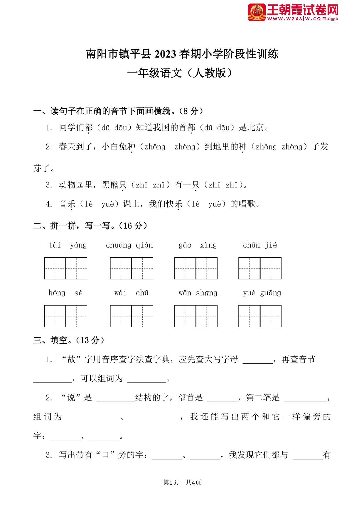 河南省南阳市镇平县2022-2023学年第二学期期中阶段性训练一年级语文(人教版)