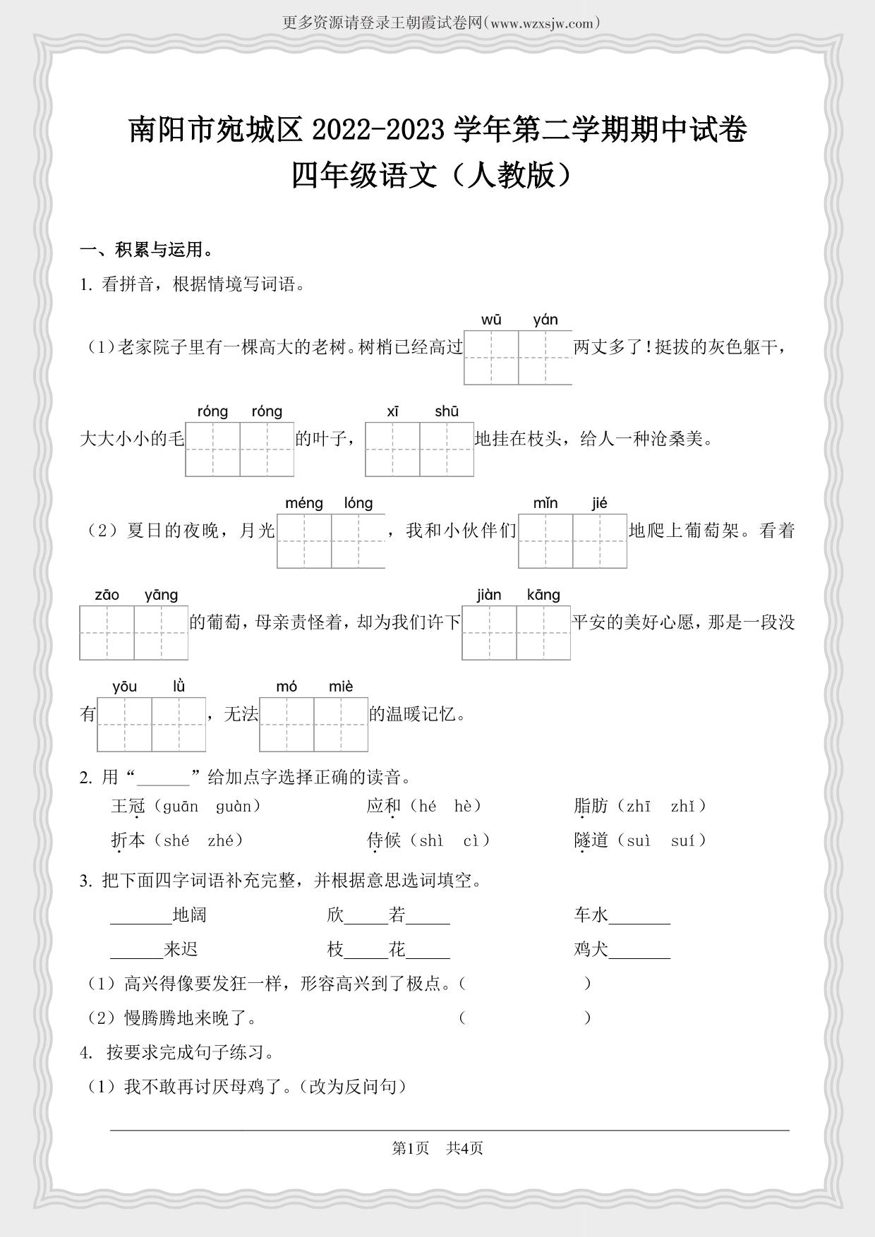 河南省南阳市宛城区2022-2023学年第二学期期中试卷四年级语文(人教版)