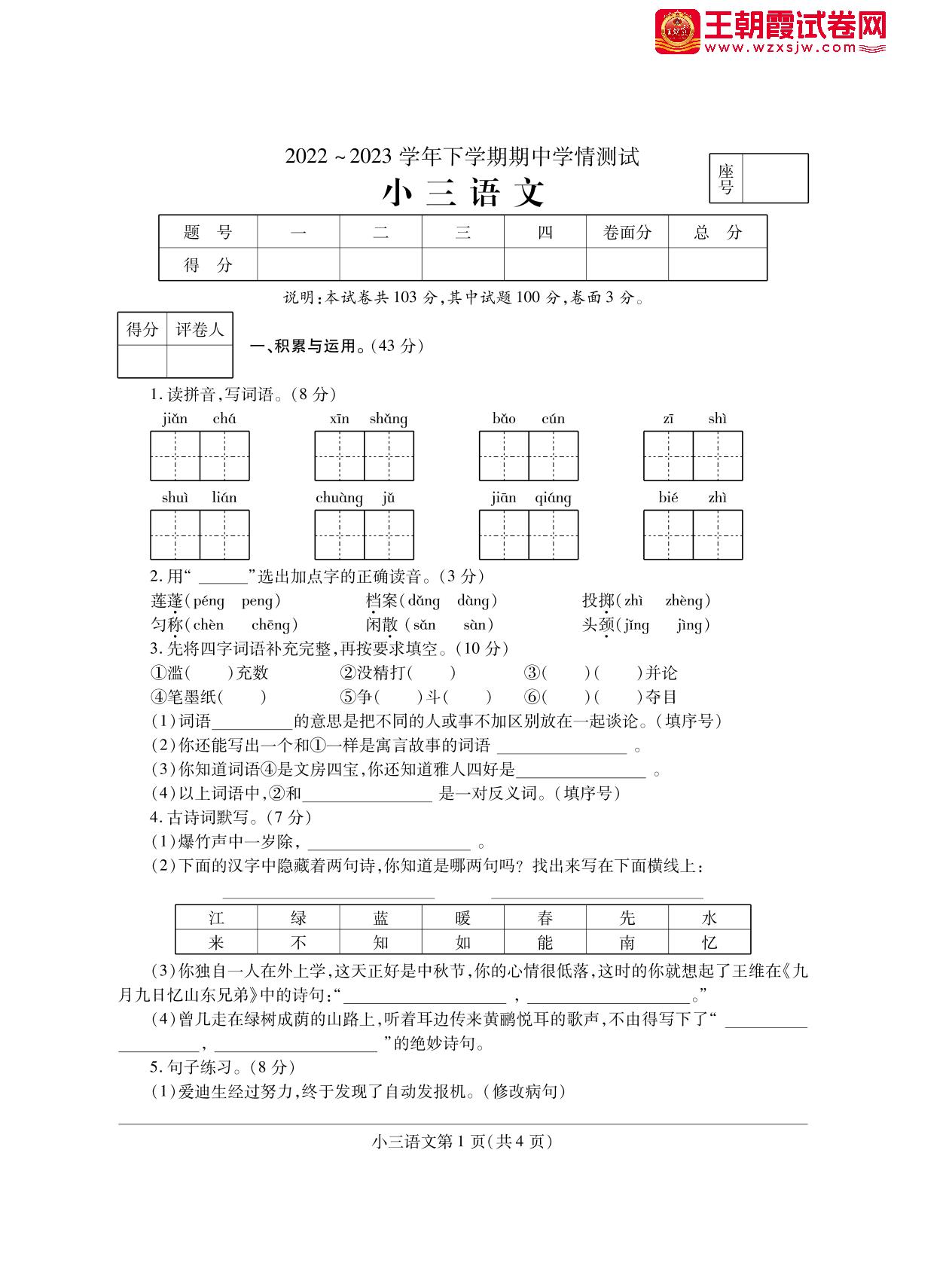 河南省平顶山市郏县2022-2023学年下学期期中学情测试试卷三年级语文(人教版)