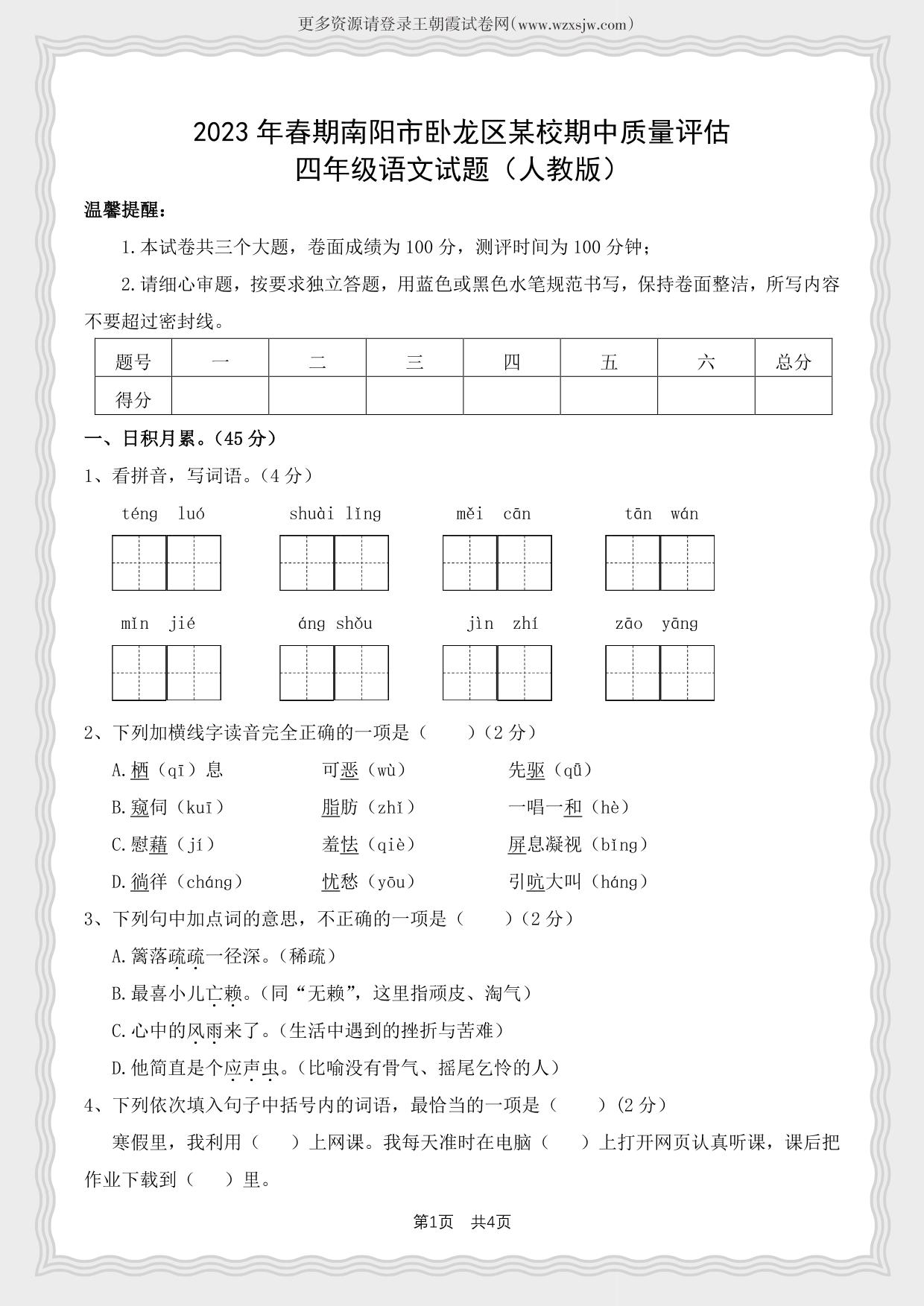 河南省南阳市卧龙区某校2022-2023学年第二学期期中质量评估试卷四年级语文(人教版)