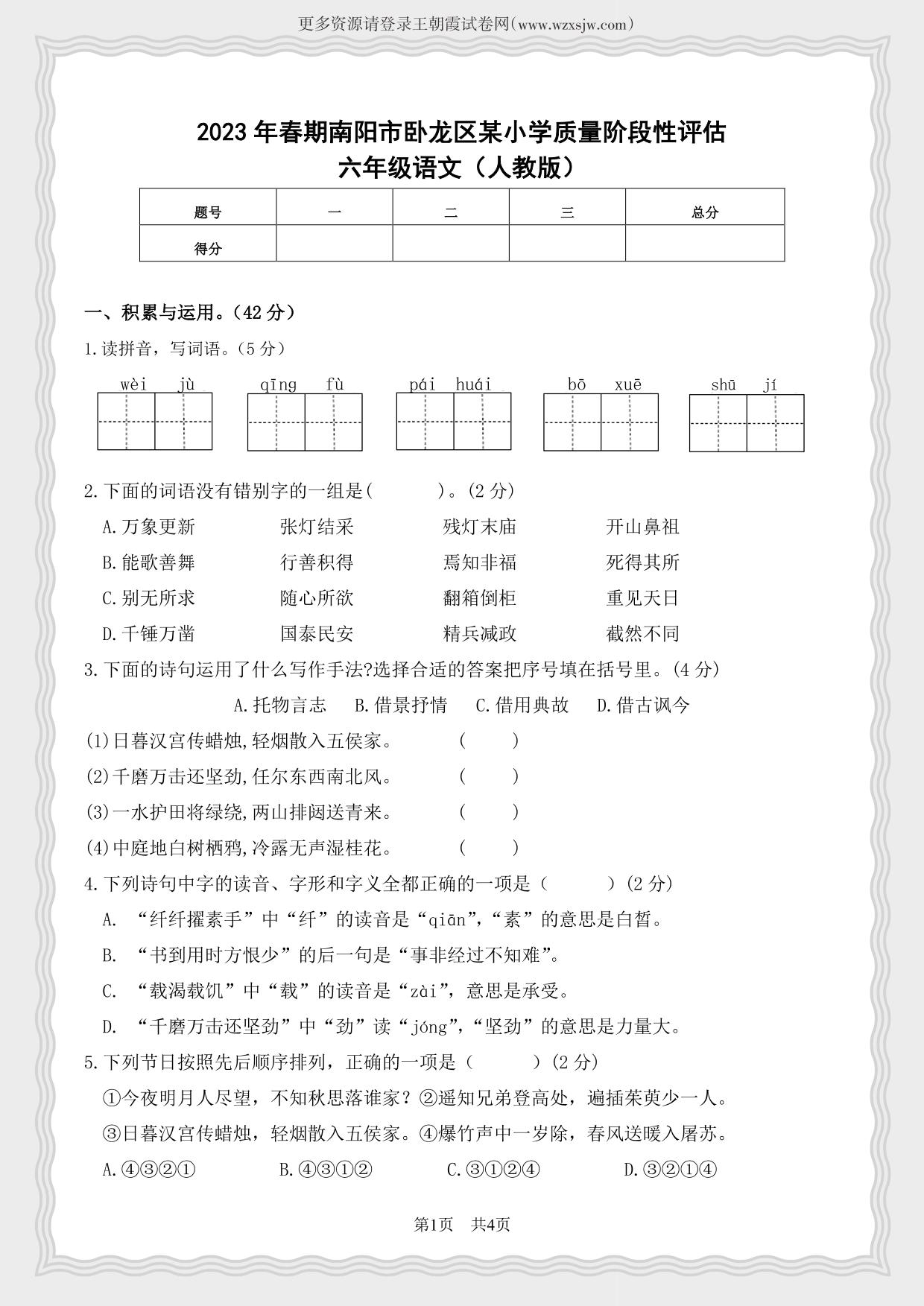 河南省南阳市卧龙区某校2022-2023学年第二学期文期中质量评估试卷六年级语(人教版)