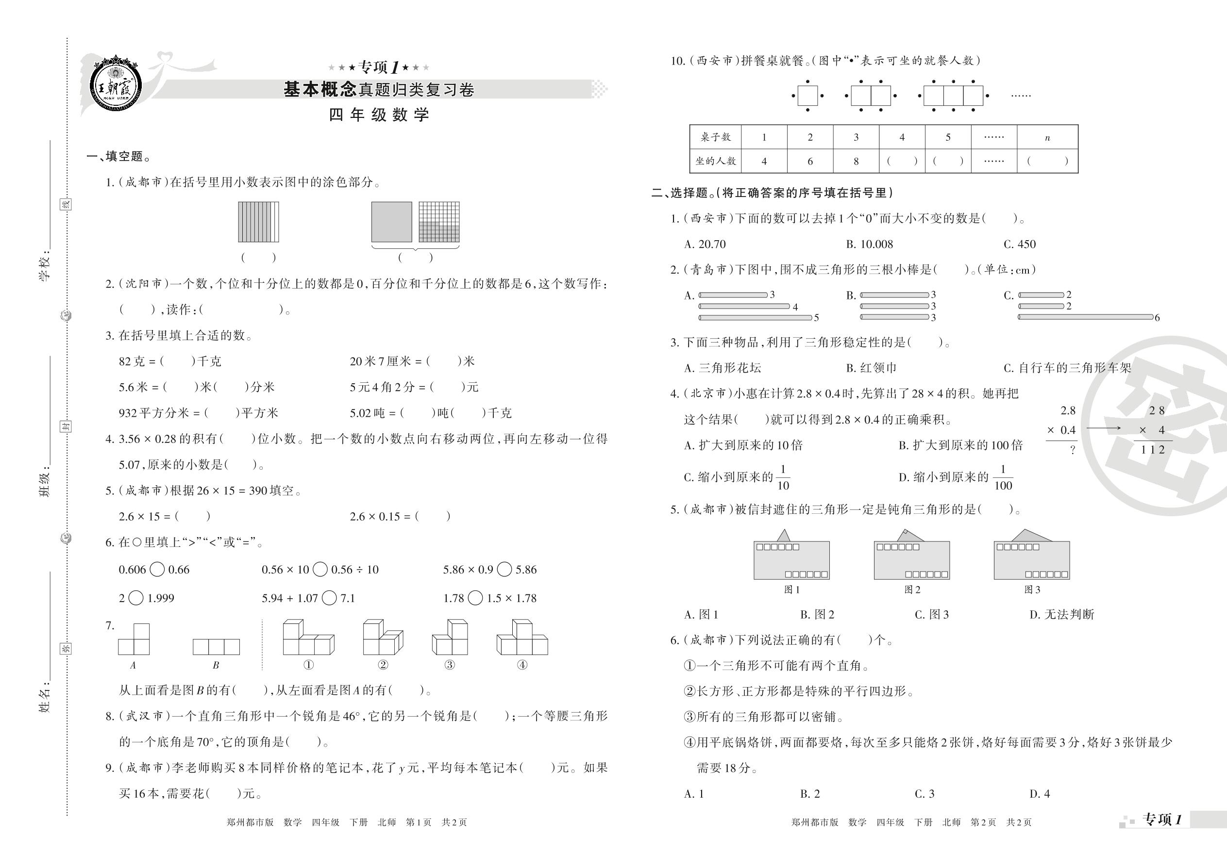 王朝霞期末专项卷——基本概念、计算真题归类复习四年级下册数学(北师版)_R210804134038【0】