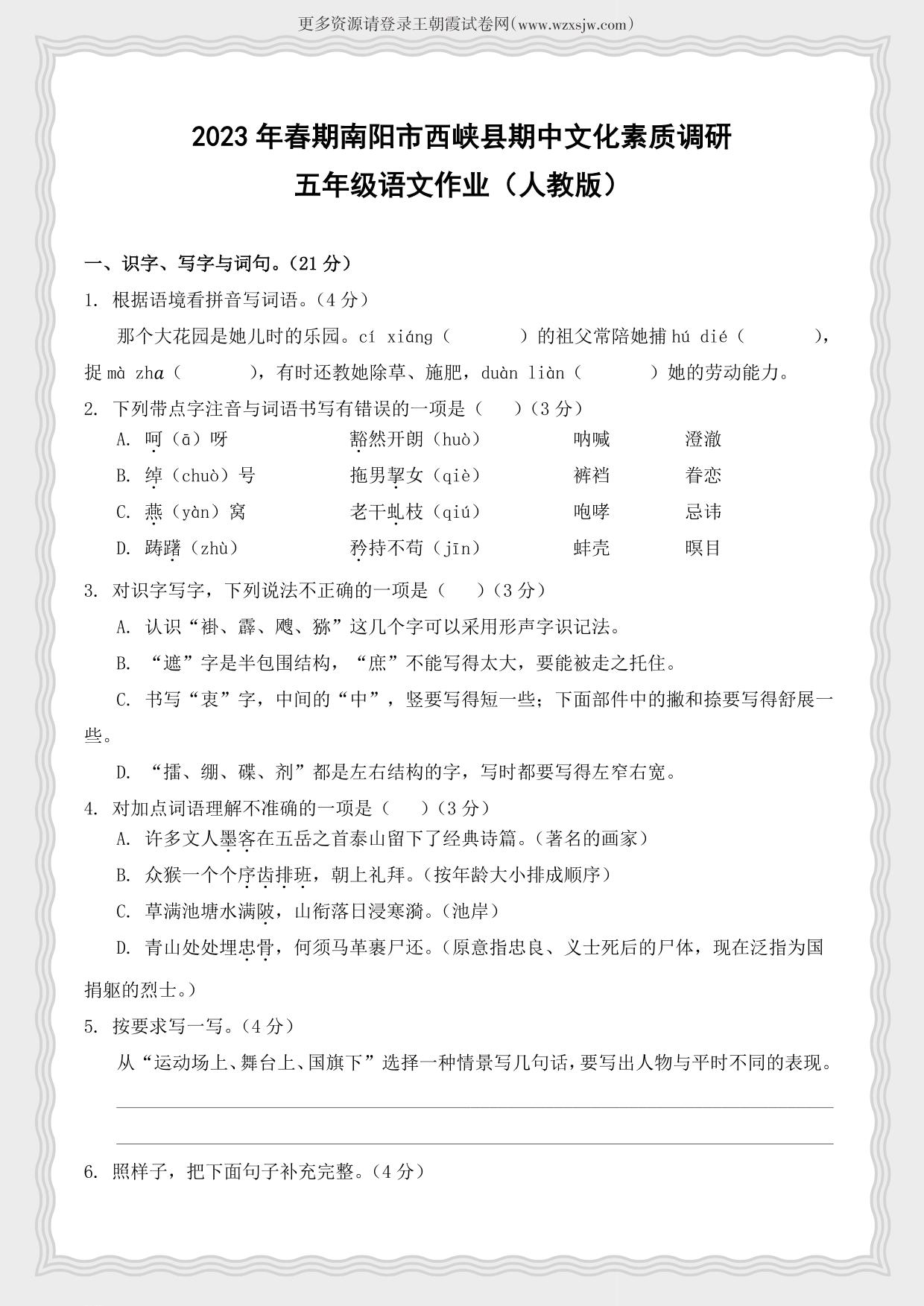 河南省南阳市西峡县2022-2023学年第二学期期中素质调研试卷五年级语文(人教版)