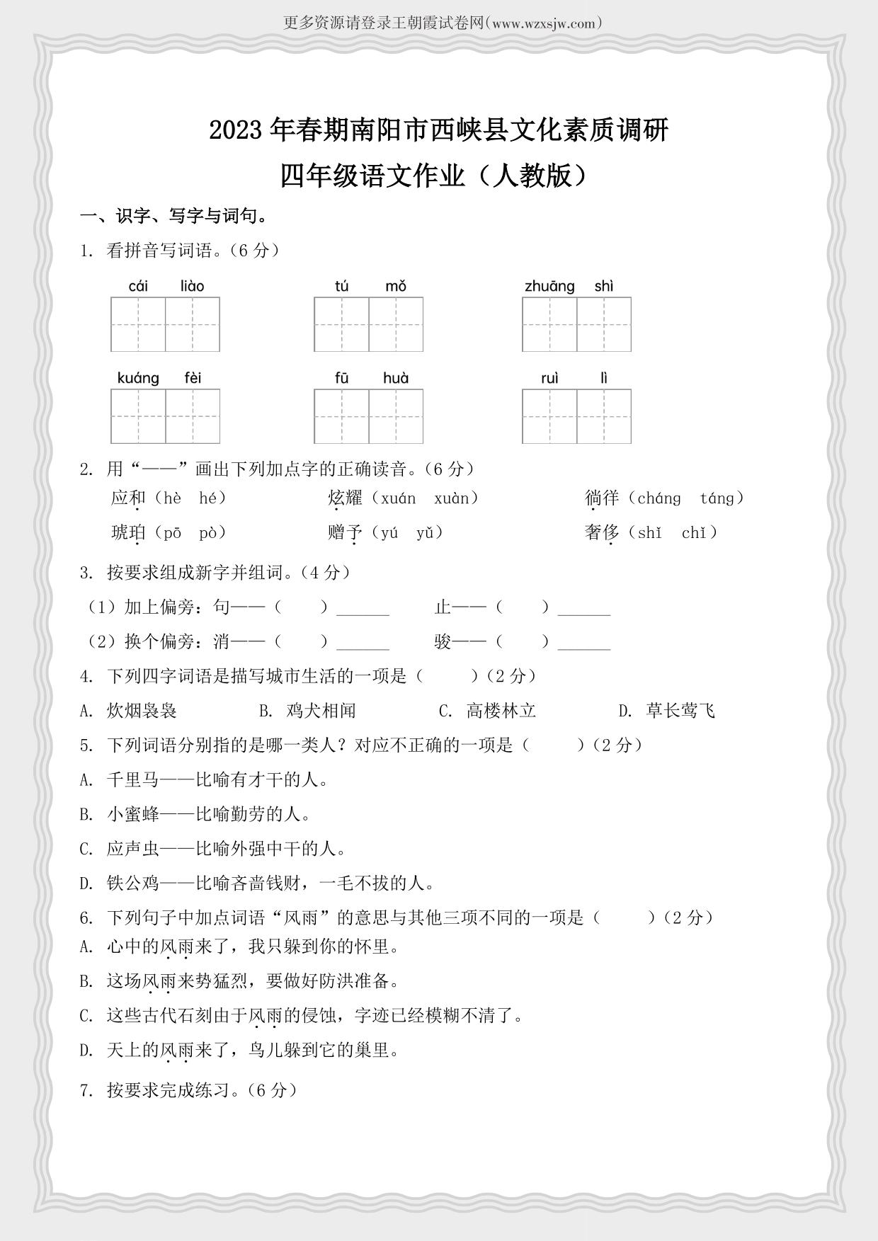河南省南阳市西峡县2022-2023学年第二学期期中素质调研试卷四年级语文(人教版)