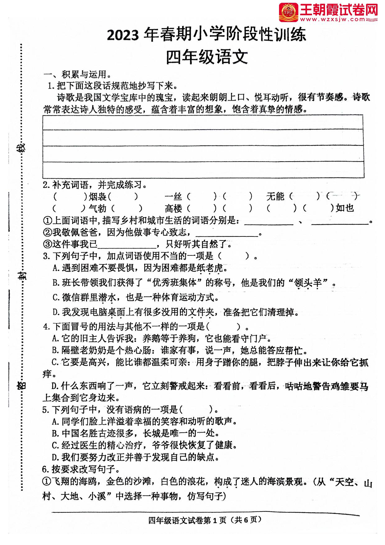 河南省南阳市镇平县2022-2023学年第二学期(期中)小学阶段性训练试卷四年级语文(人教版)