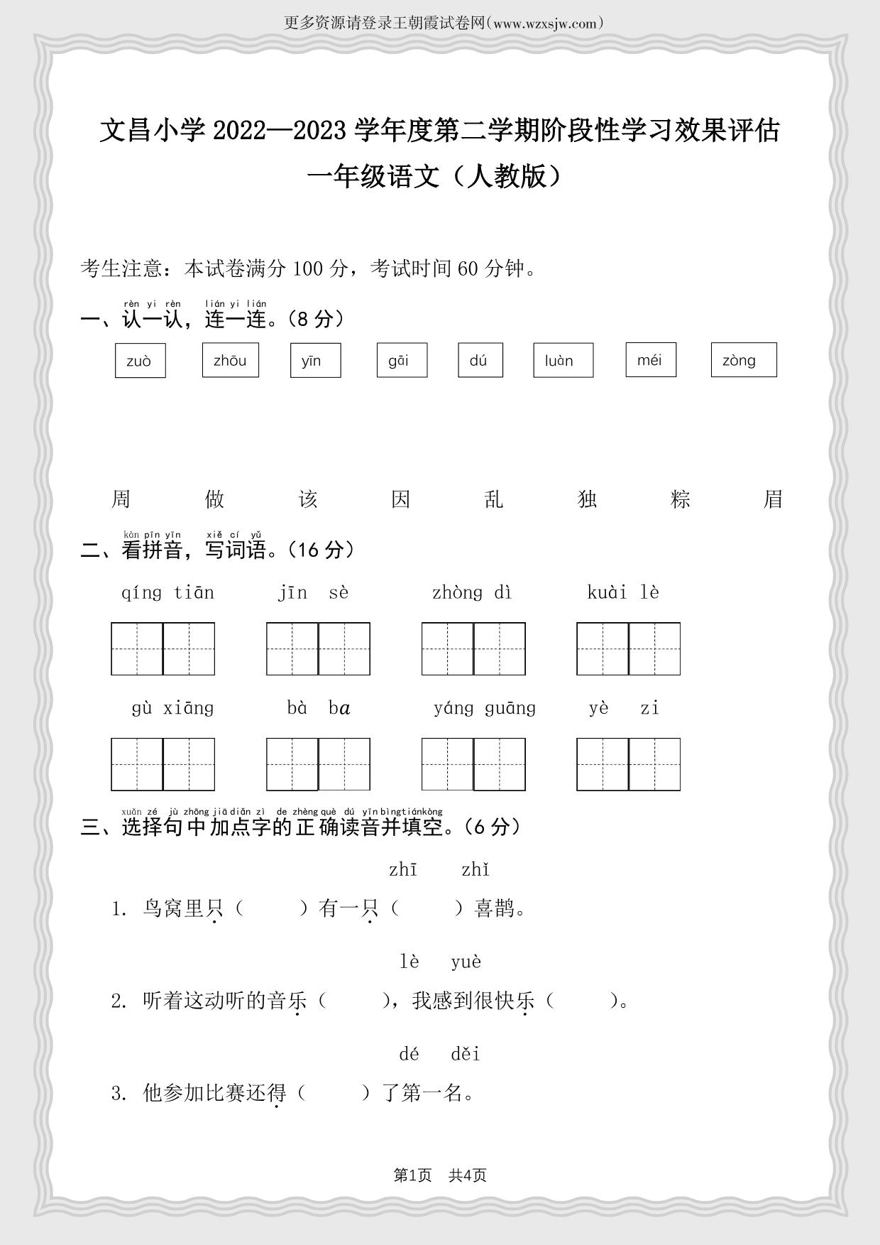 河南省周口市文昌小学2022—2023学年度第二学期阶段性学习效果评估 一年级语文(人教版)