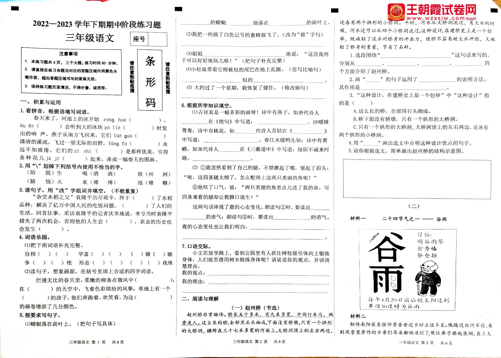 河南省周口市西华县2022-2023学年三年级下学期期中语文练习题(人教版)
