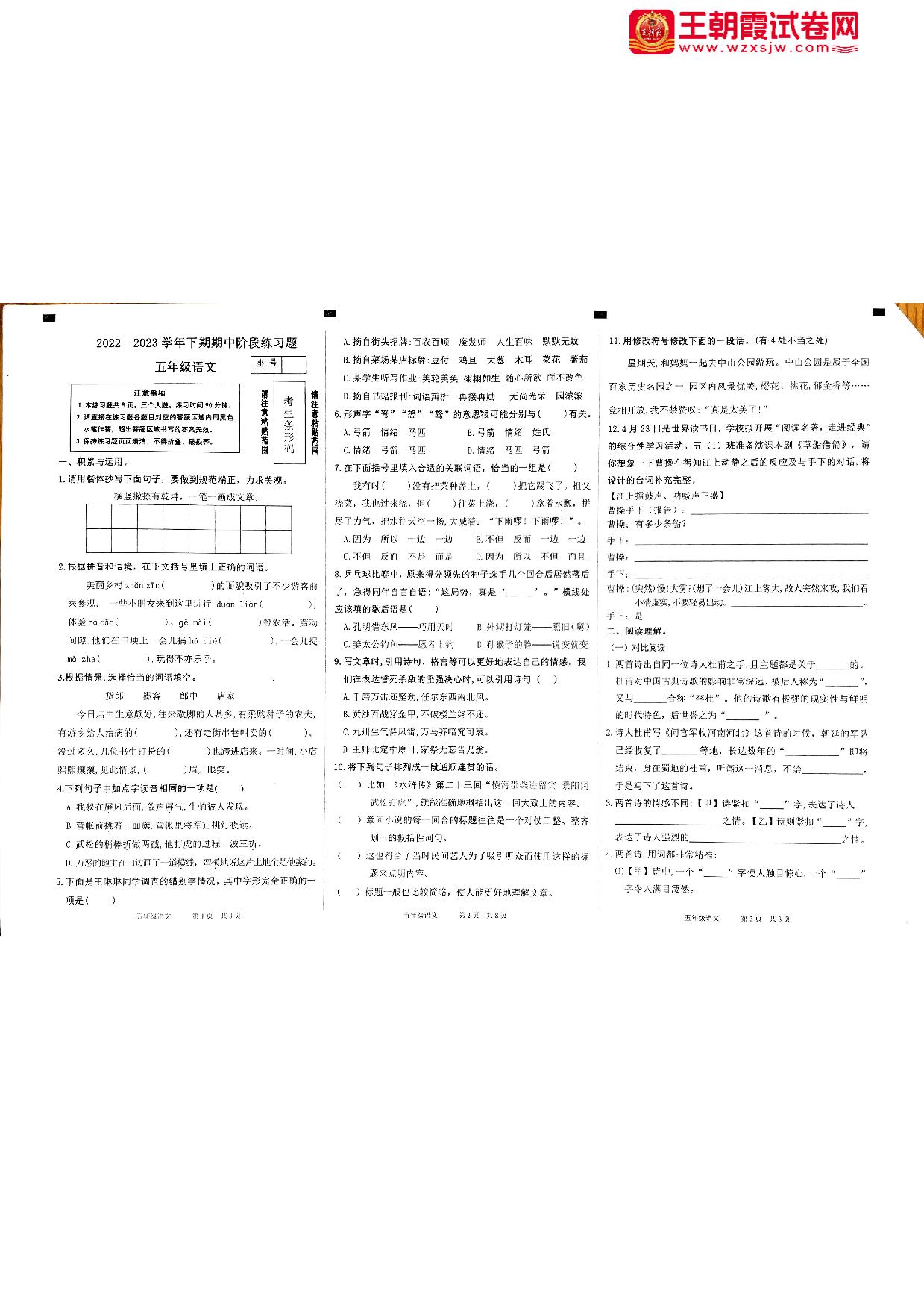 河南省周口市西华县2022-2023学年五年级下学期期中语文练习题(人教版)