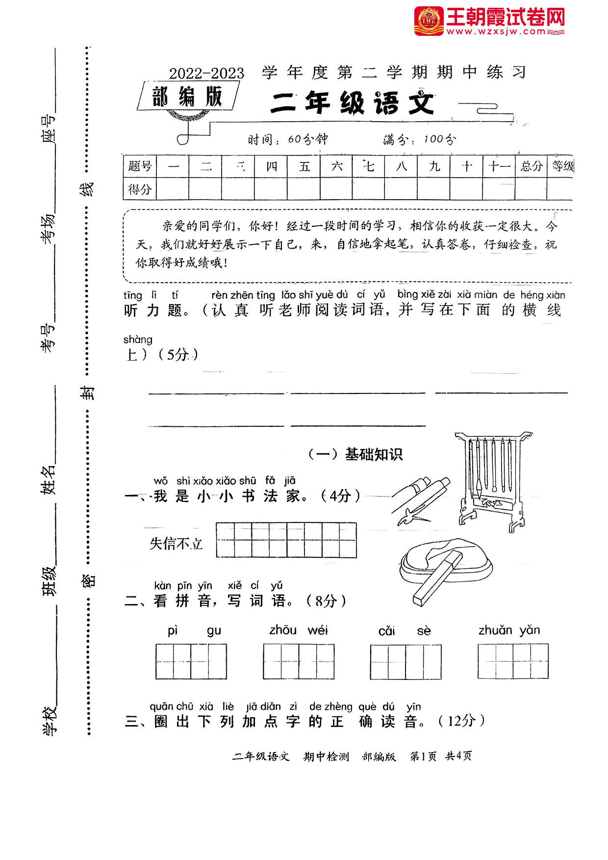 河南省周口市沈丘县中英文学校2022-2023学年第二学期二年级语文期中练习(人教版)