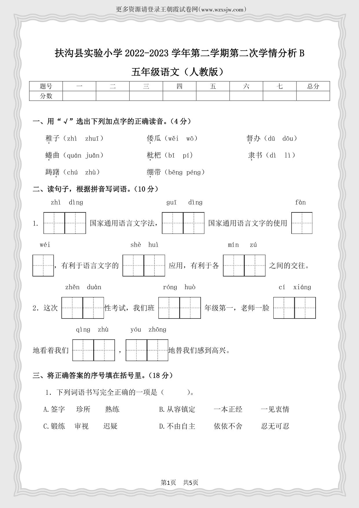 河南省周口市扶沟县实验小学2022-2023学年第二学期五年级语文第二次学情分析B卷(人教版)