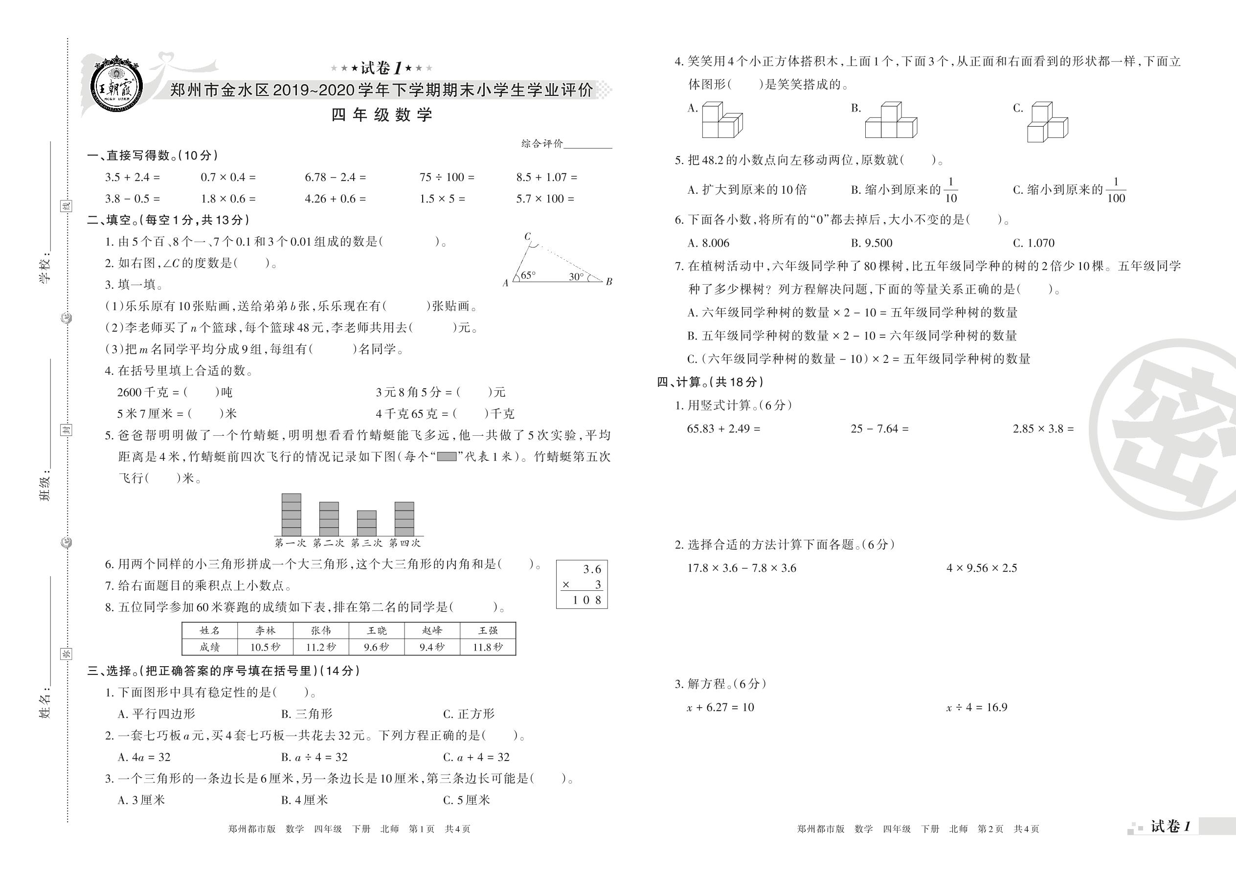 2019-2020学年第二学期郑州市金水区四年级数学试卷(北师版)_R210804134048【1】