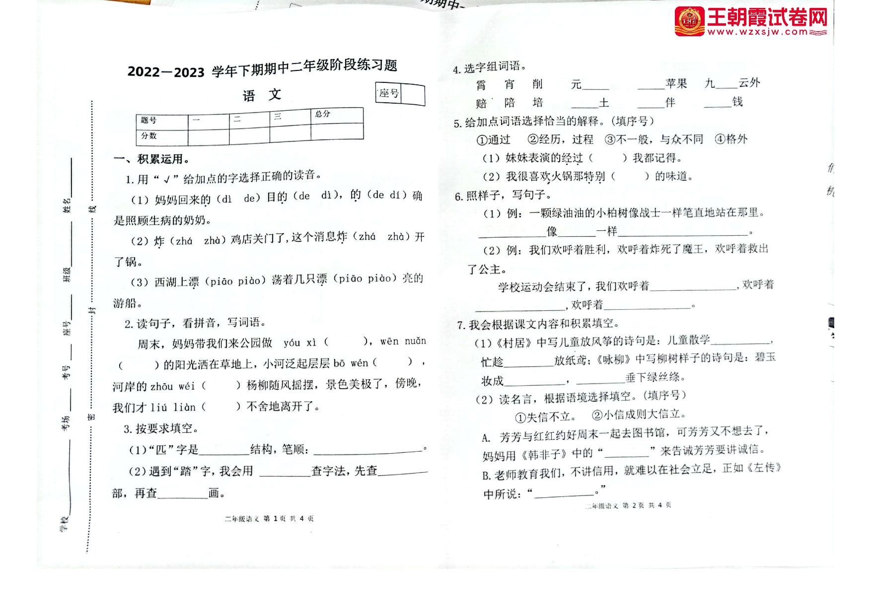 二年级语文人教版下册期中卷