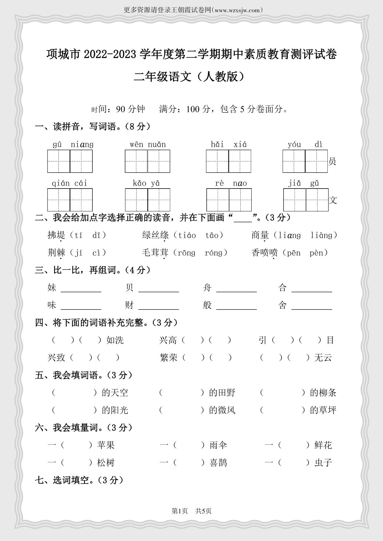 河南省周口市项城市2022-2023学年第二学期二年级语文期中素质教育测评试卷(人教版)