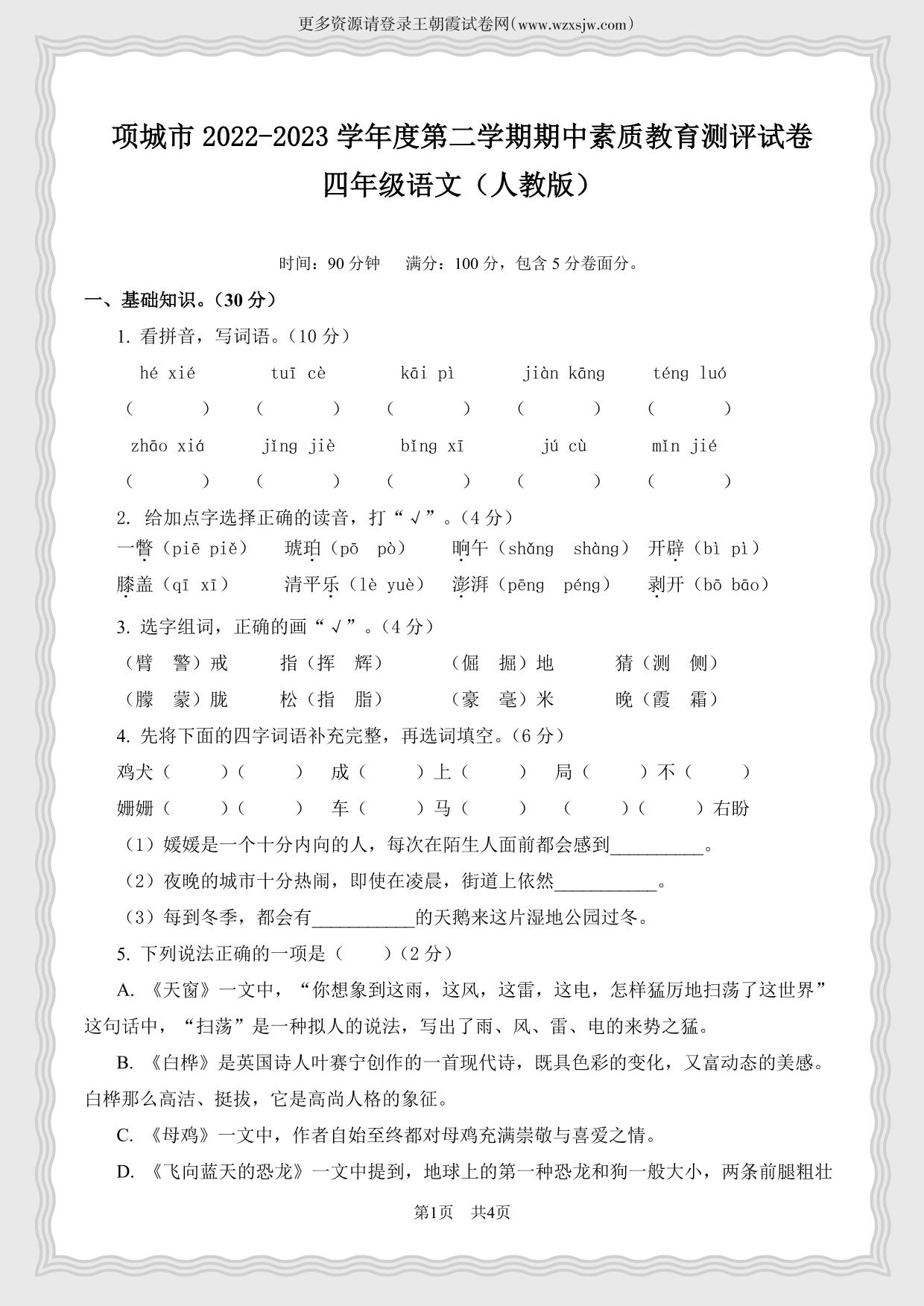 河南省周口市项城市2022-2023学年第二学期四年级语文期中素质教育测评试卷(人教版)