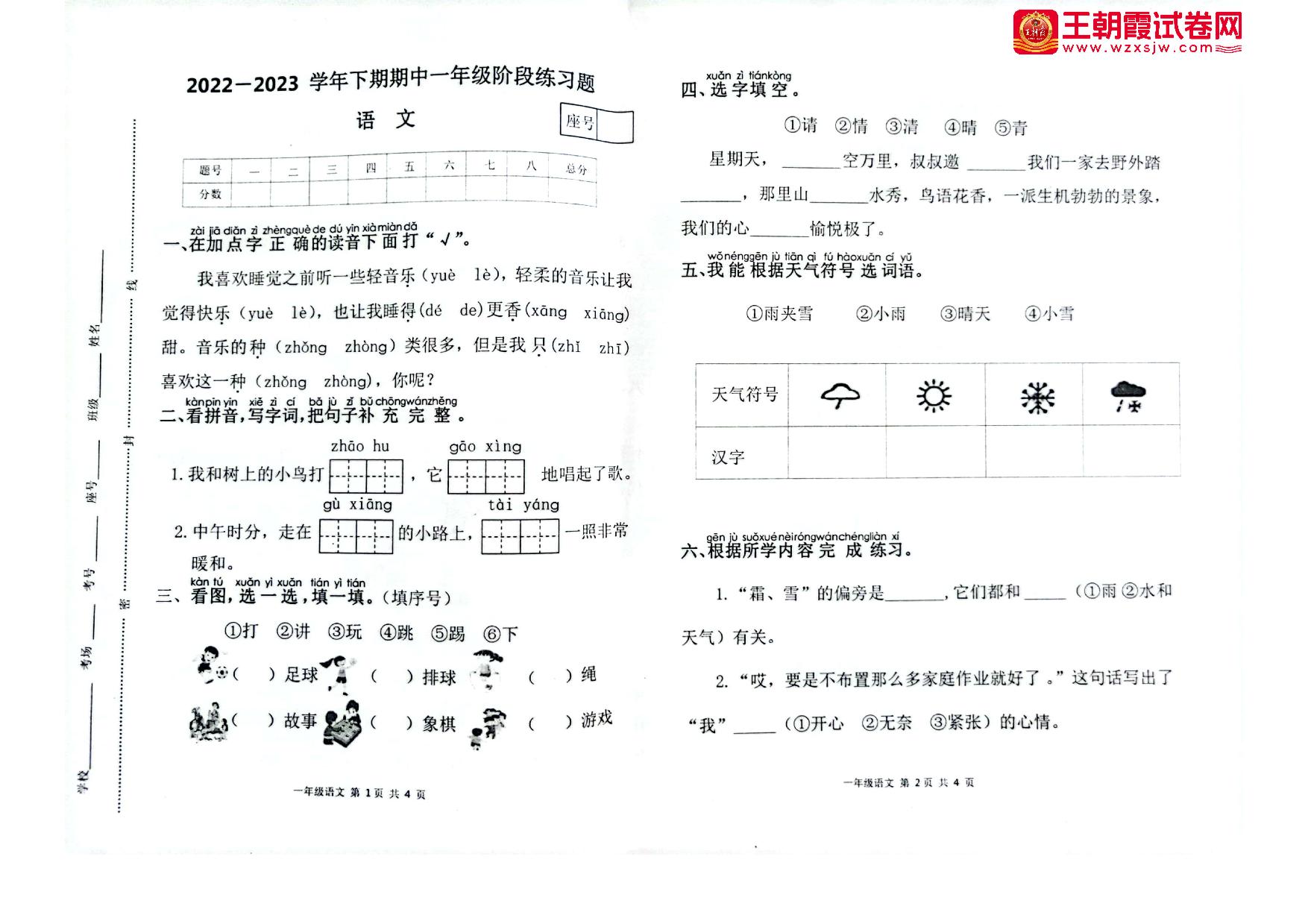 一年级语文人教版下册期中卷