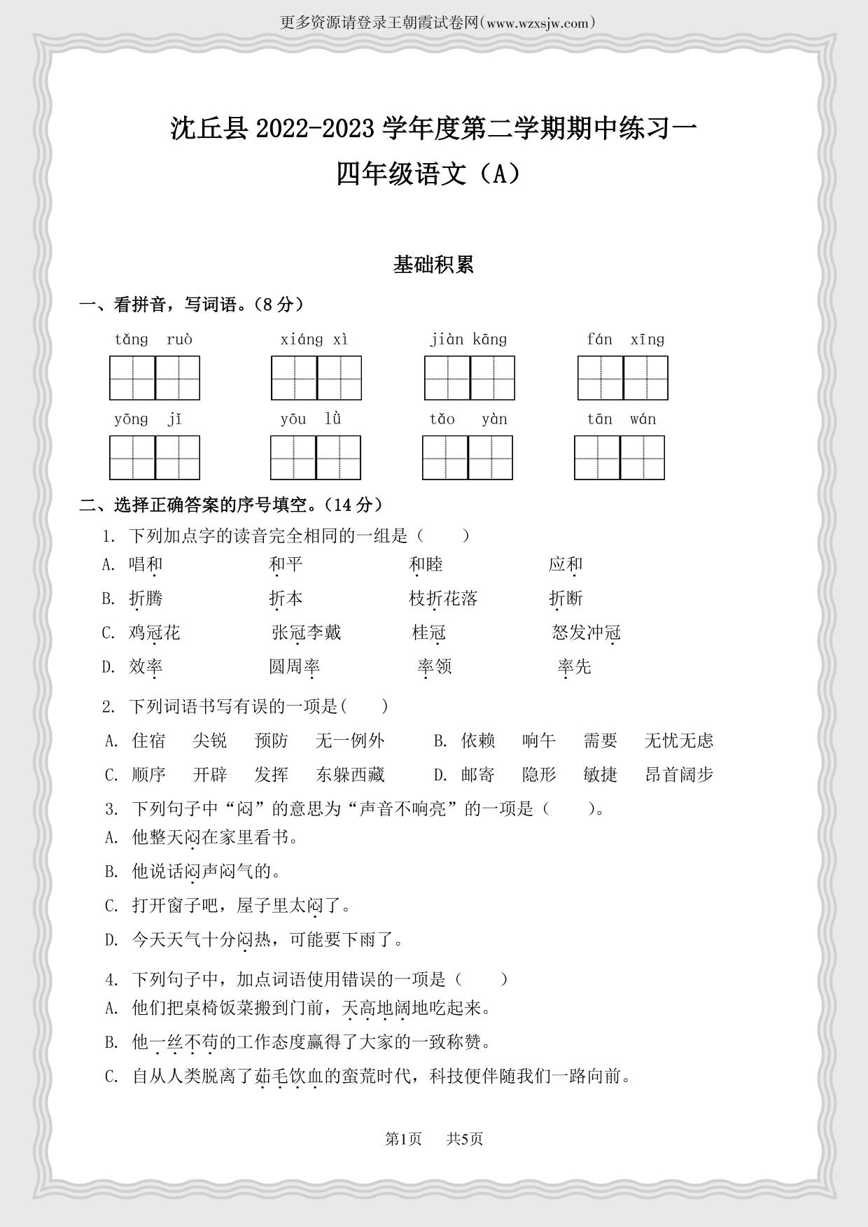 河南省周口市沈丘县2022-2023学年第二学期四年级语文期中练习一(人教版)