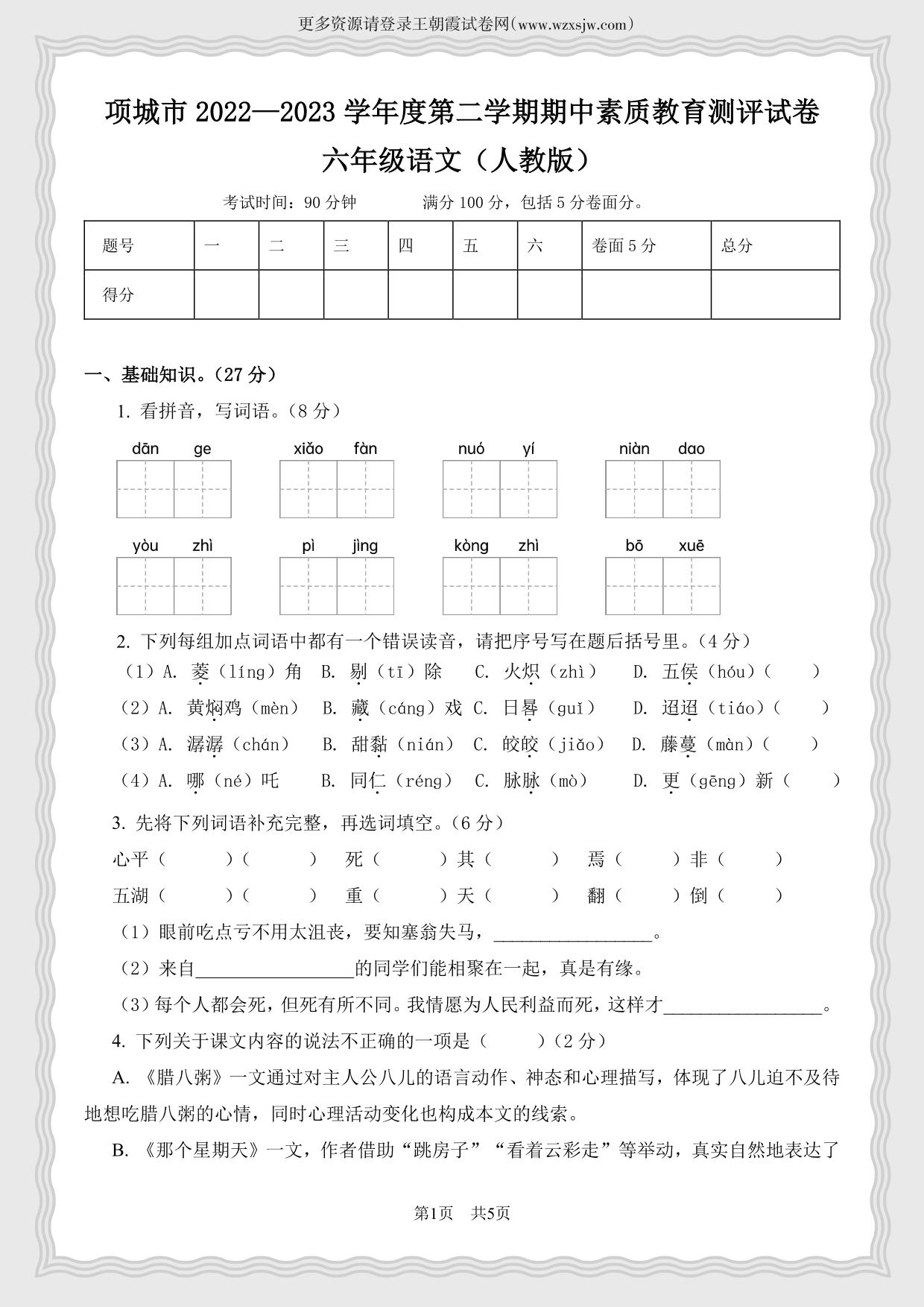 河南省周口市项城市2022-2023学年第二学期六年级语文期中素质教育测评试卷(人教版)