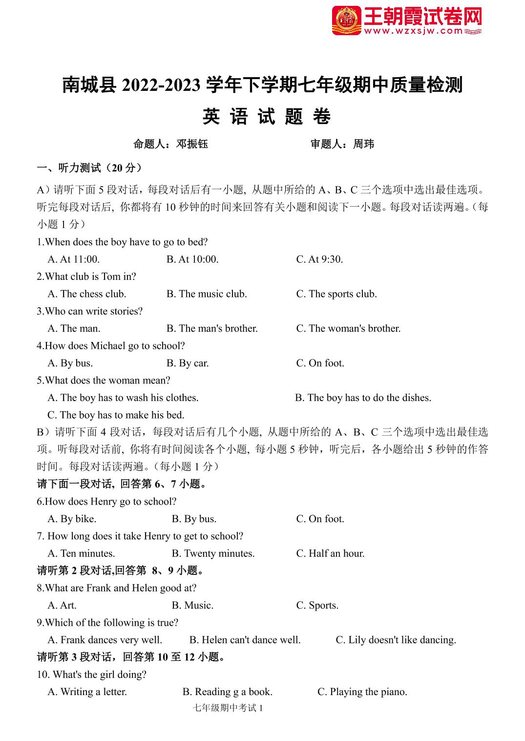 江西省抚州市南城县2022-2023学年下学期期中质量检测七年级英语(人教版)【无听力音频】