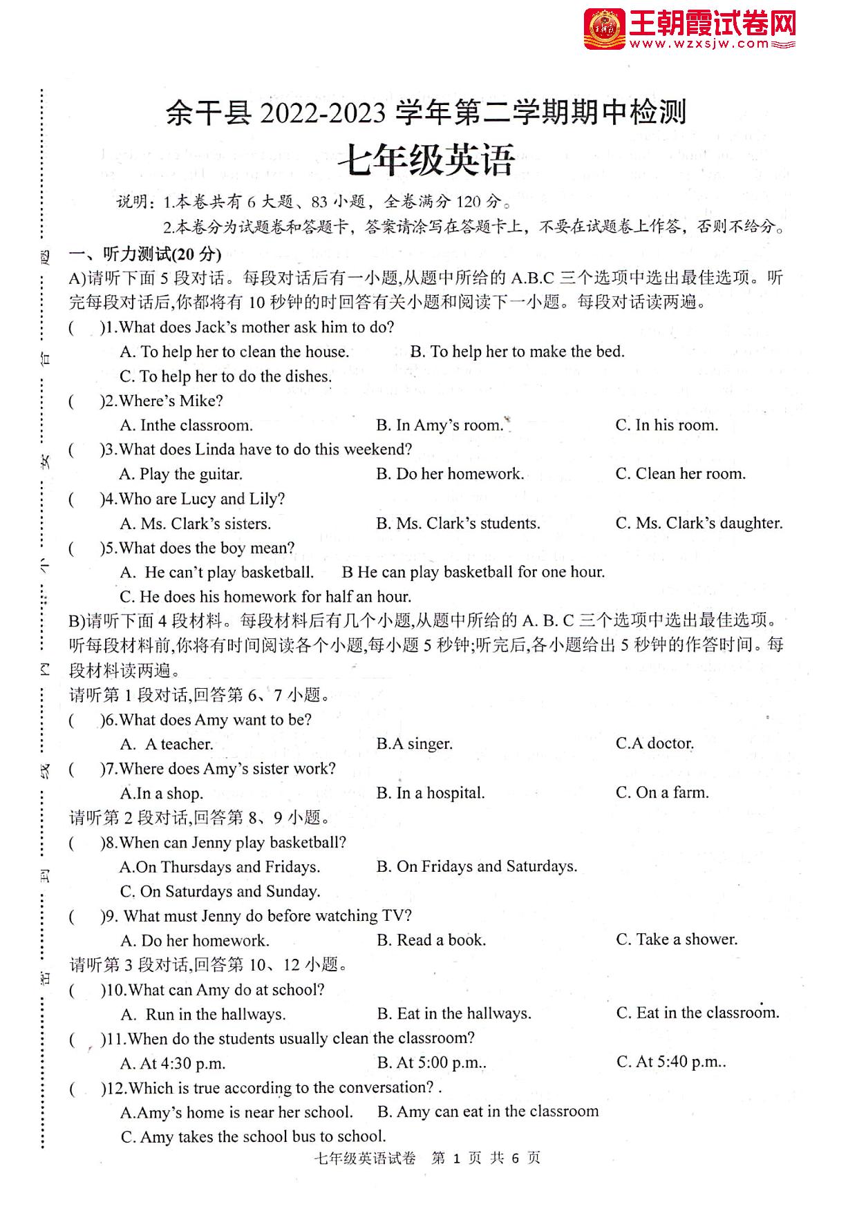 江西省上饶市余干县2022-2023学年第二学期期中检测七年级英语(人教版)