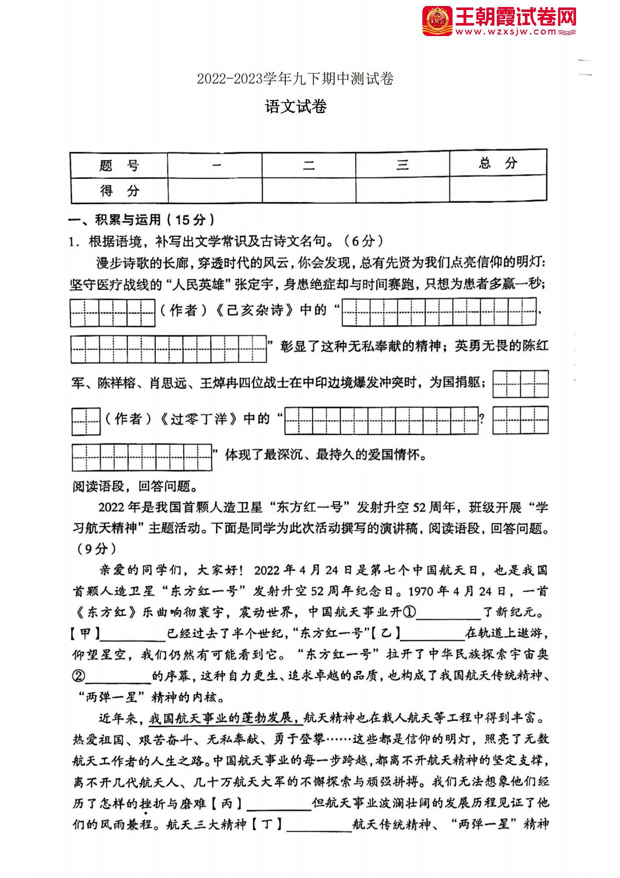 吉林省松原市宁江区三校联考2022-2023学年下学期期中考试试卷九年级语文(人教版)
