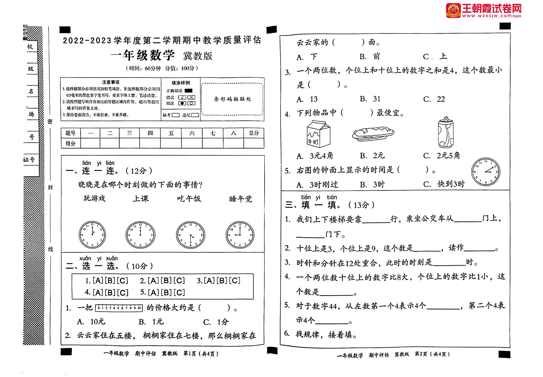 河北省邢台市威县2022-2023学年度第二学期期中教学质量评估一年级数学(冀教版)