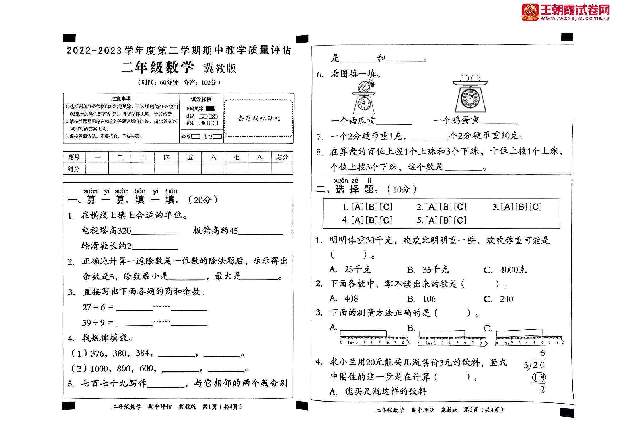 河北省邢台市威县2022-2023学年度第二学期期中教学质量评估二年级数学(冀教版)
