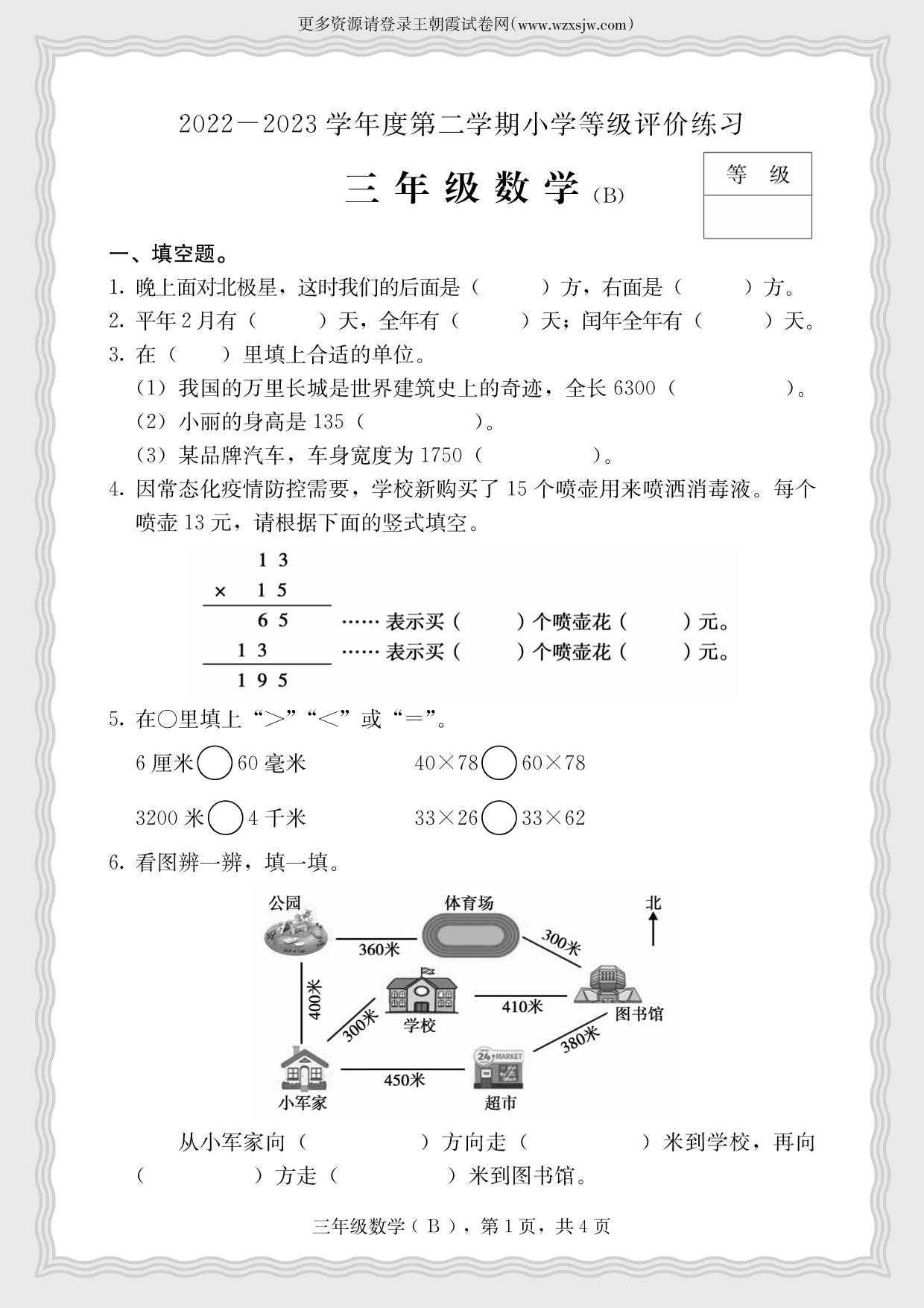 河北省石家庄市高邑县2022-2023学年度第二学期小学等级评价练习期中试卷三年级数学(冀教版)