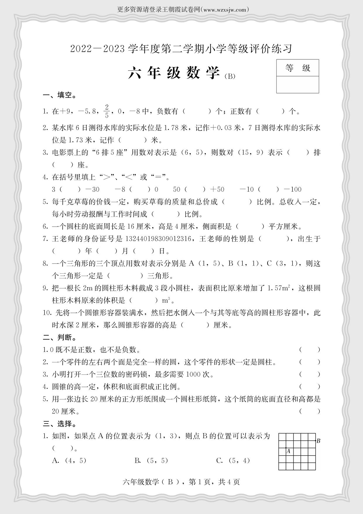河北省石家庄市高邑县2022-2023学年度第二学期小学等级评价练习期中试卷六年级数学(冀教版)