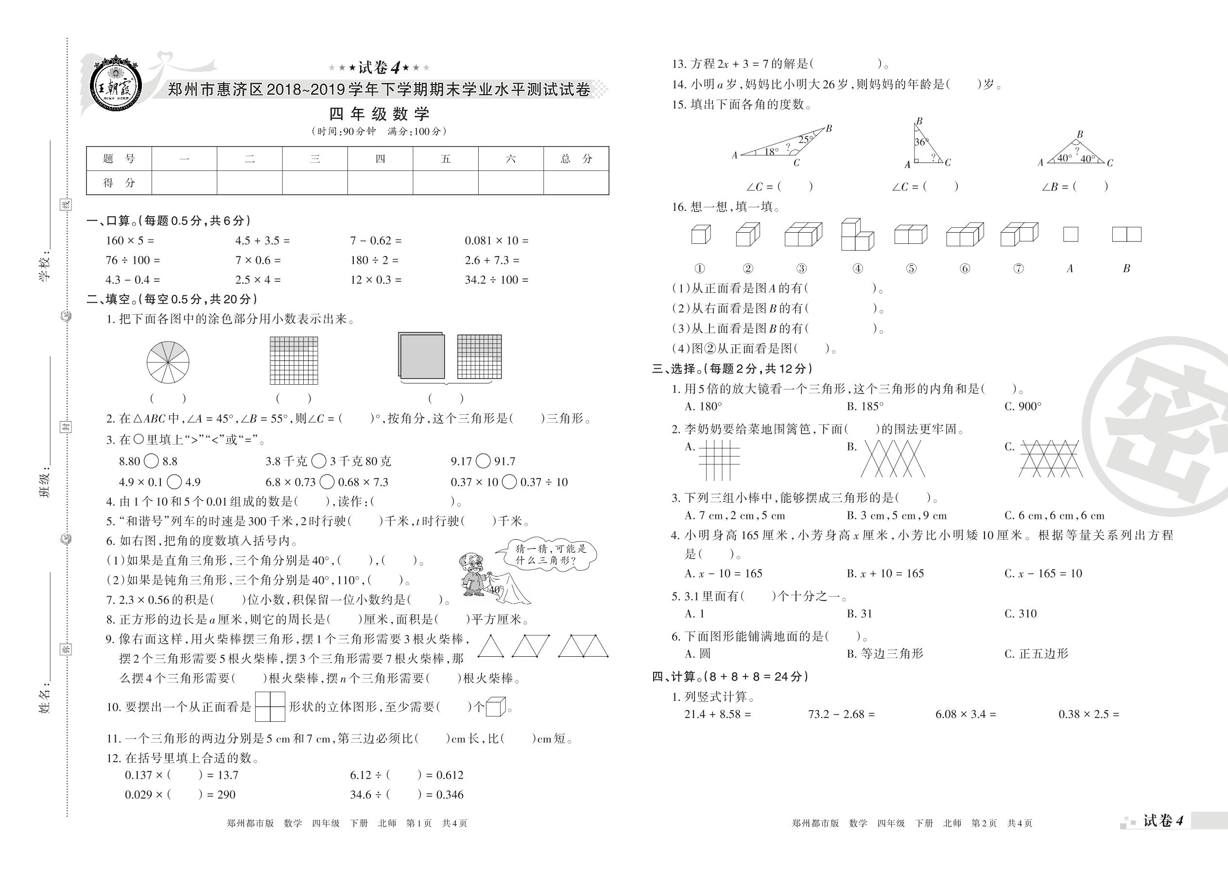2018-2019学年第二学期郑州市惠济区四年级数学试卷(北师版)【4】