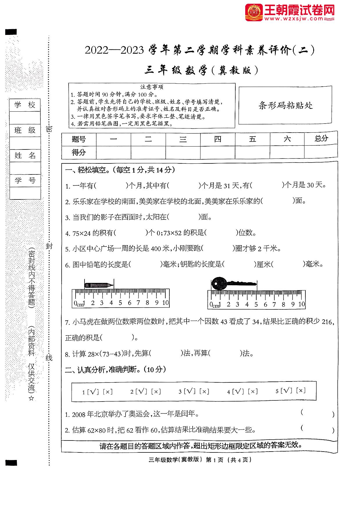 河北省邢台市南和县2022-2023学年第二学期期中学科素养评价三年级数学(冀教版)