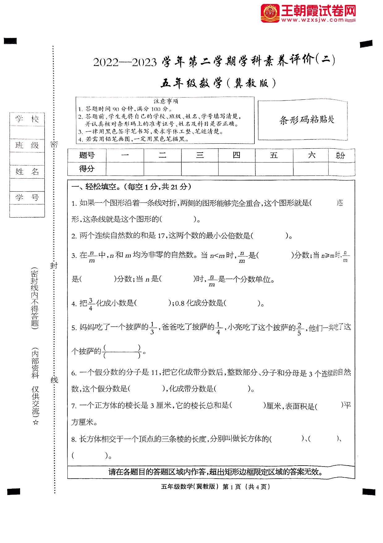 河北省邢台市南和县2022-2023学年第二学期期中学科素养评价五年级数学(冀教版)