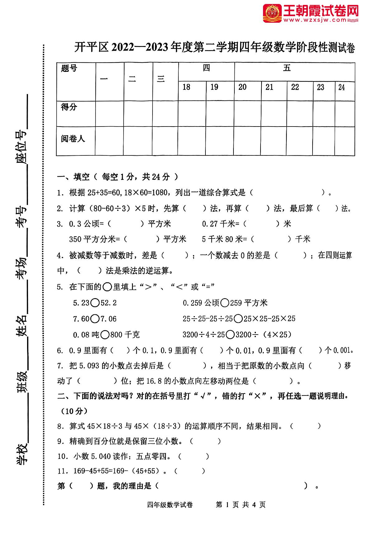 河北省唐山市开平区2022-2023学年度第二学期期中期中阶段性测试卷四年级数学(人教版)