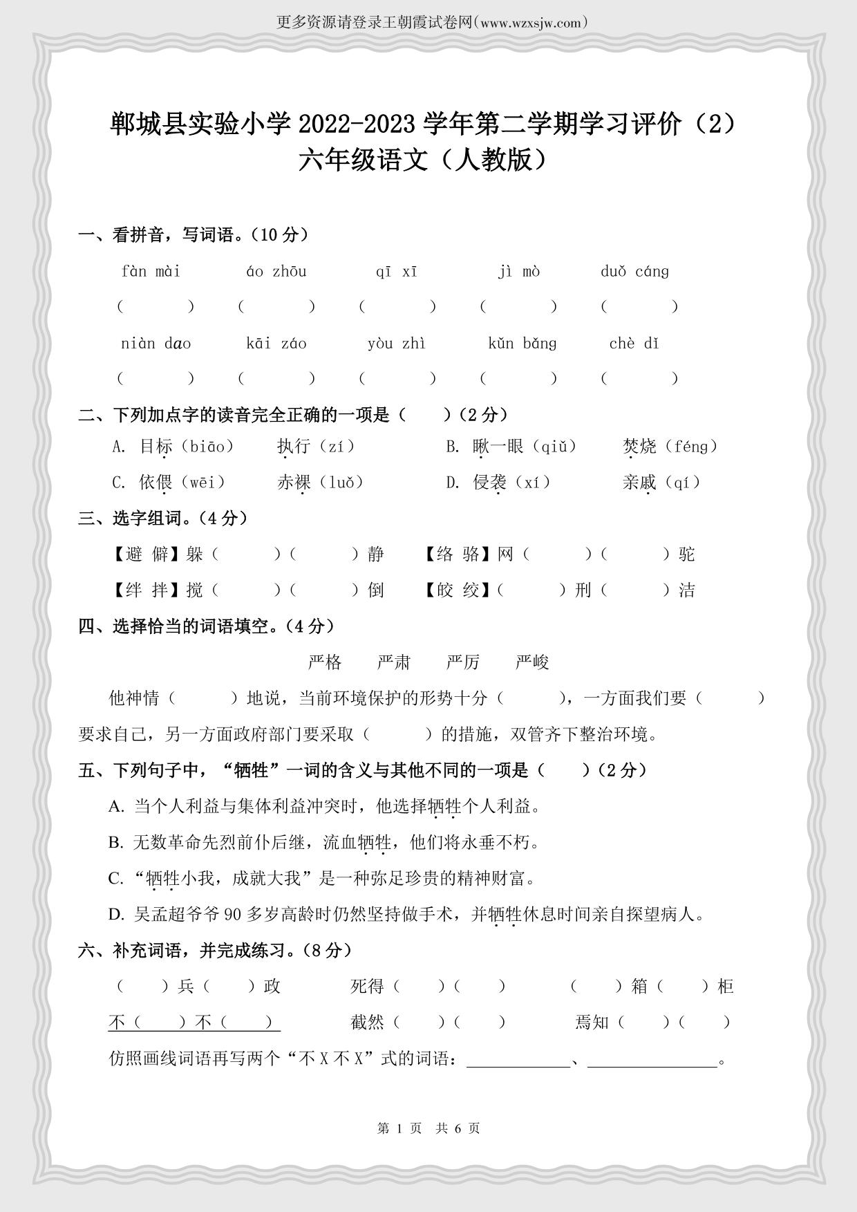河南省周口市郸城县实验小学2022-2023学年第二学期六年级语文期中学习评价(人教版)
