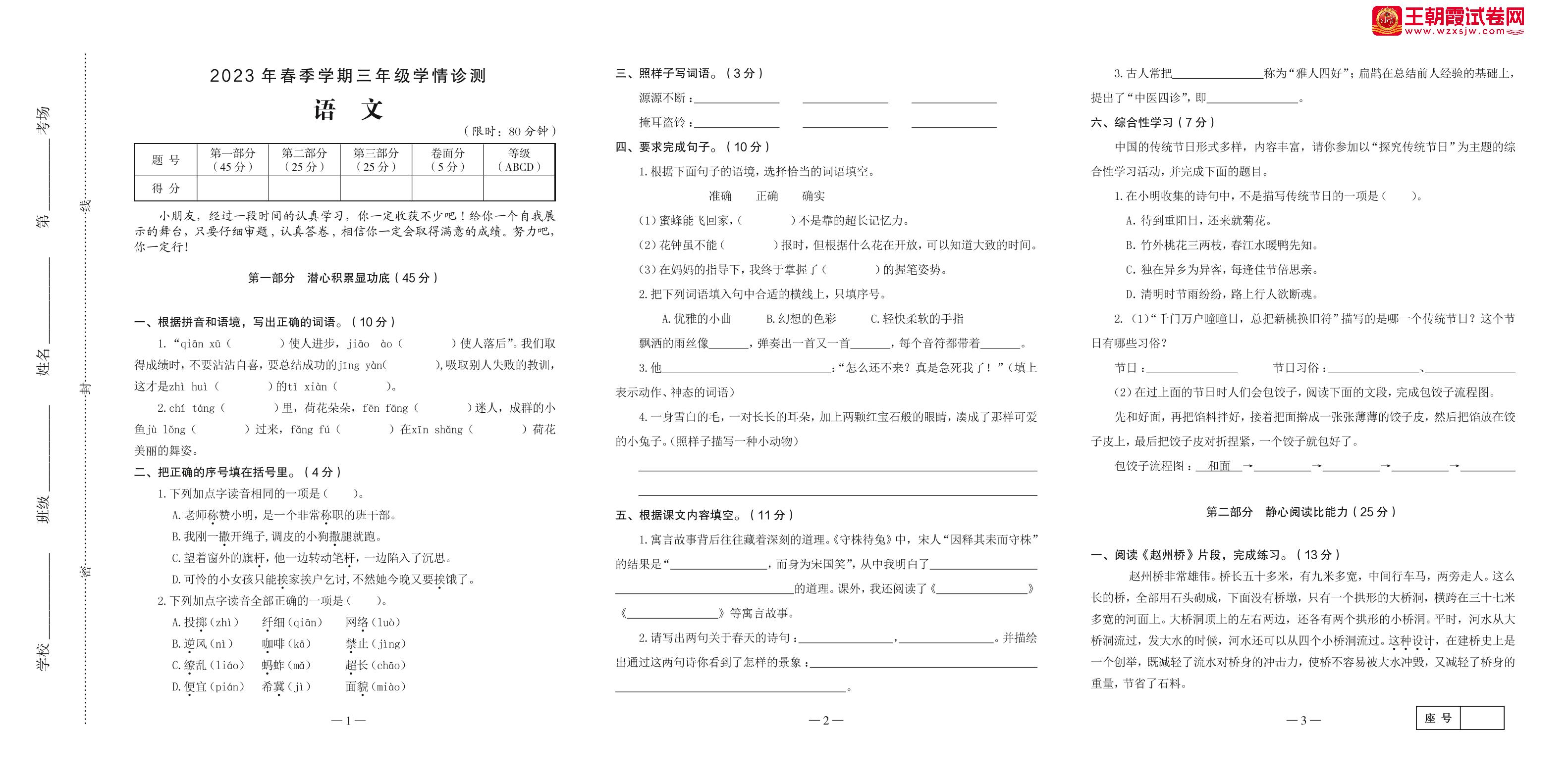 河南省三门峡市湖滨区2022-2023学年第二学期三年级语文学情诊测(人教版)