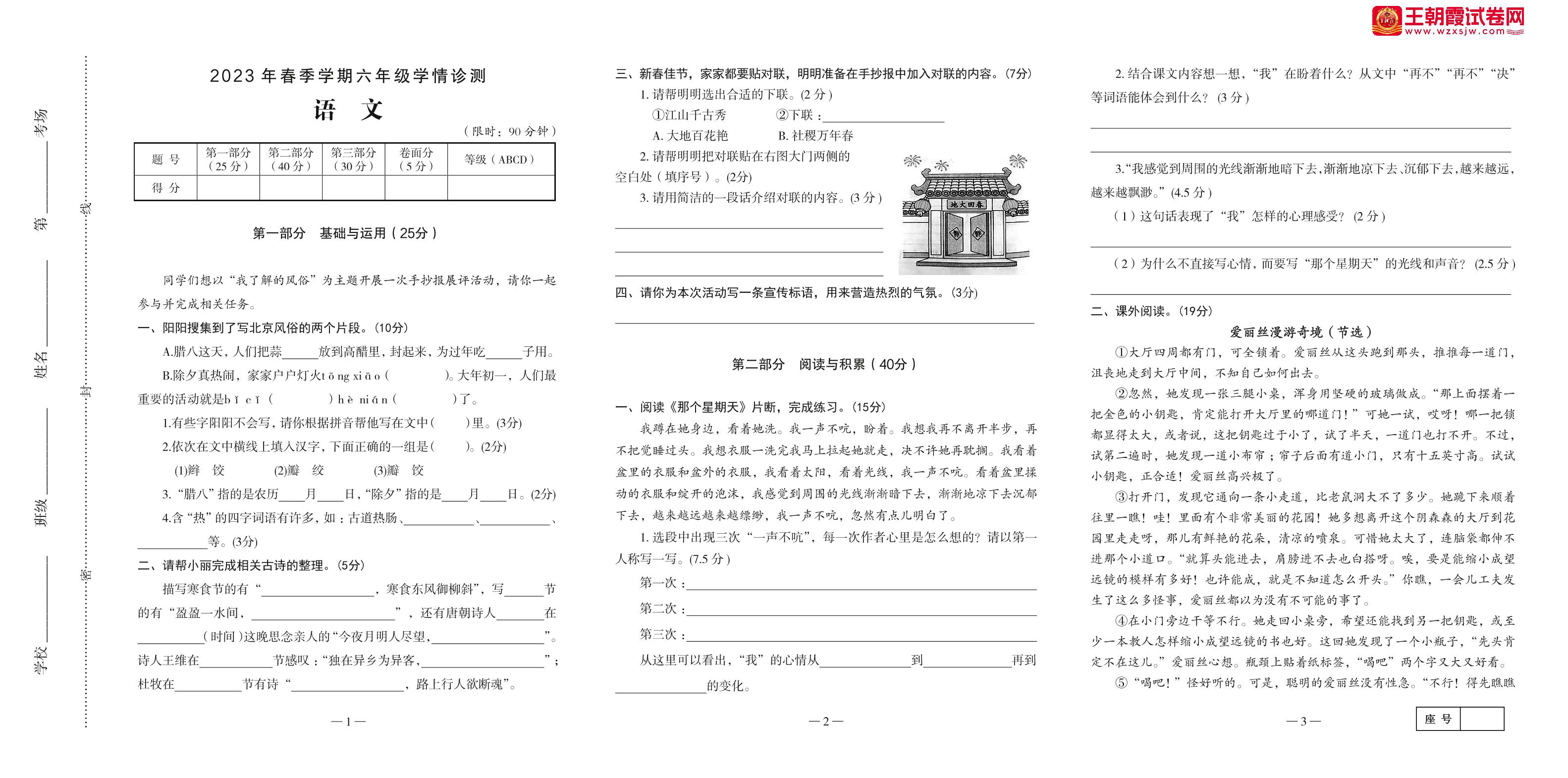 河南省三门峡市湖滨区2022-2023学年第二学期六年级语文学情诊测(人教版)