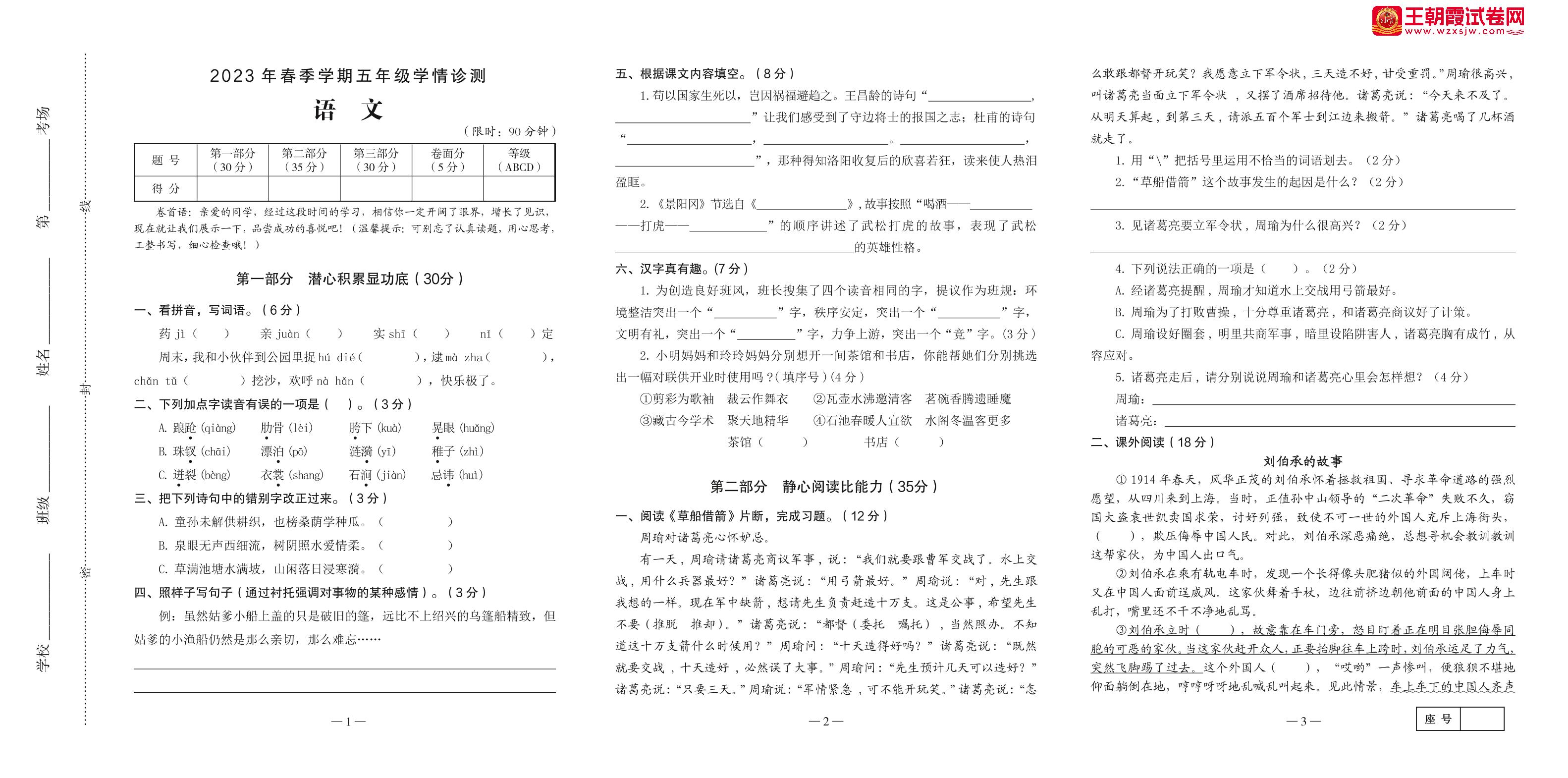 河南省三门峡市湖滨区2022-2023学年第二学期五年级语文学情诊测(人教版)