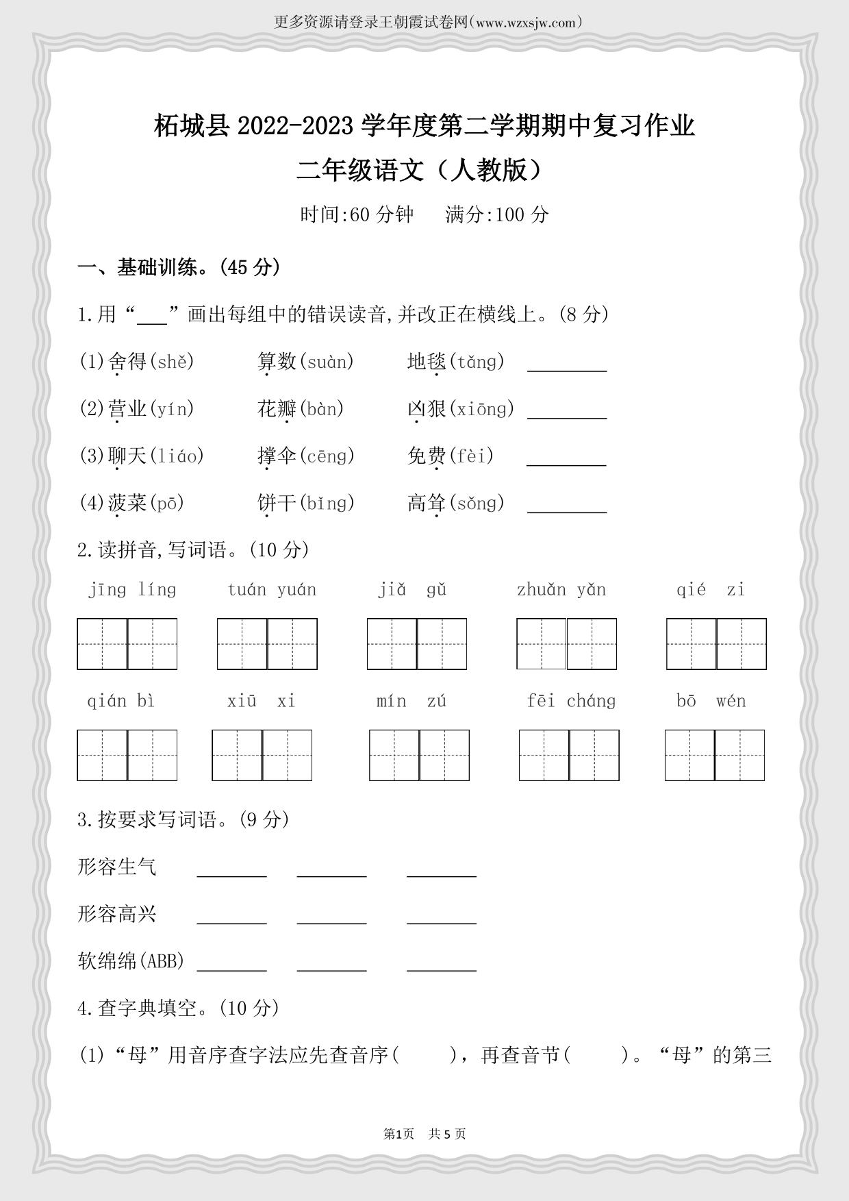 河南省商丘市柘城县2022-2023学年第二学期二年级语文期中复习作业(人教版)
