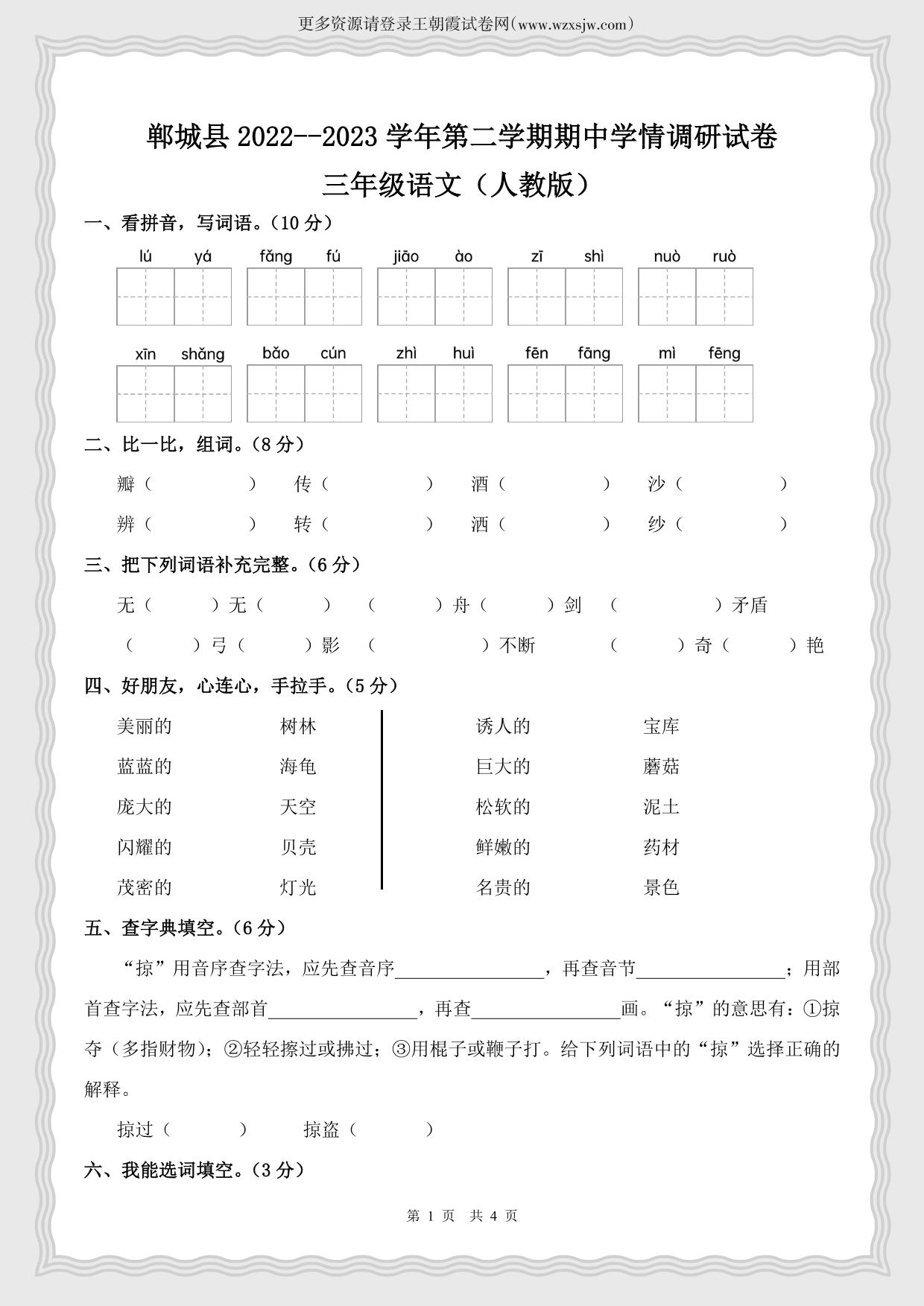 河南省周口市郸城县2022-2023学年第二学期期中学情调研试卷三年级语文(人教版)