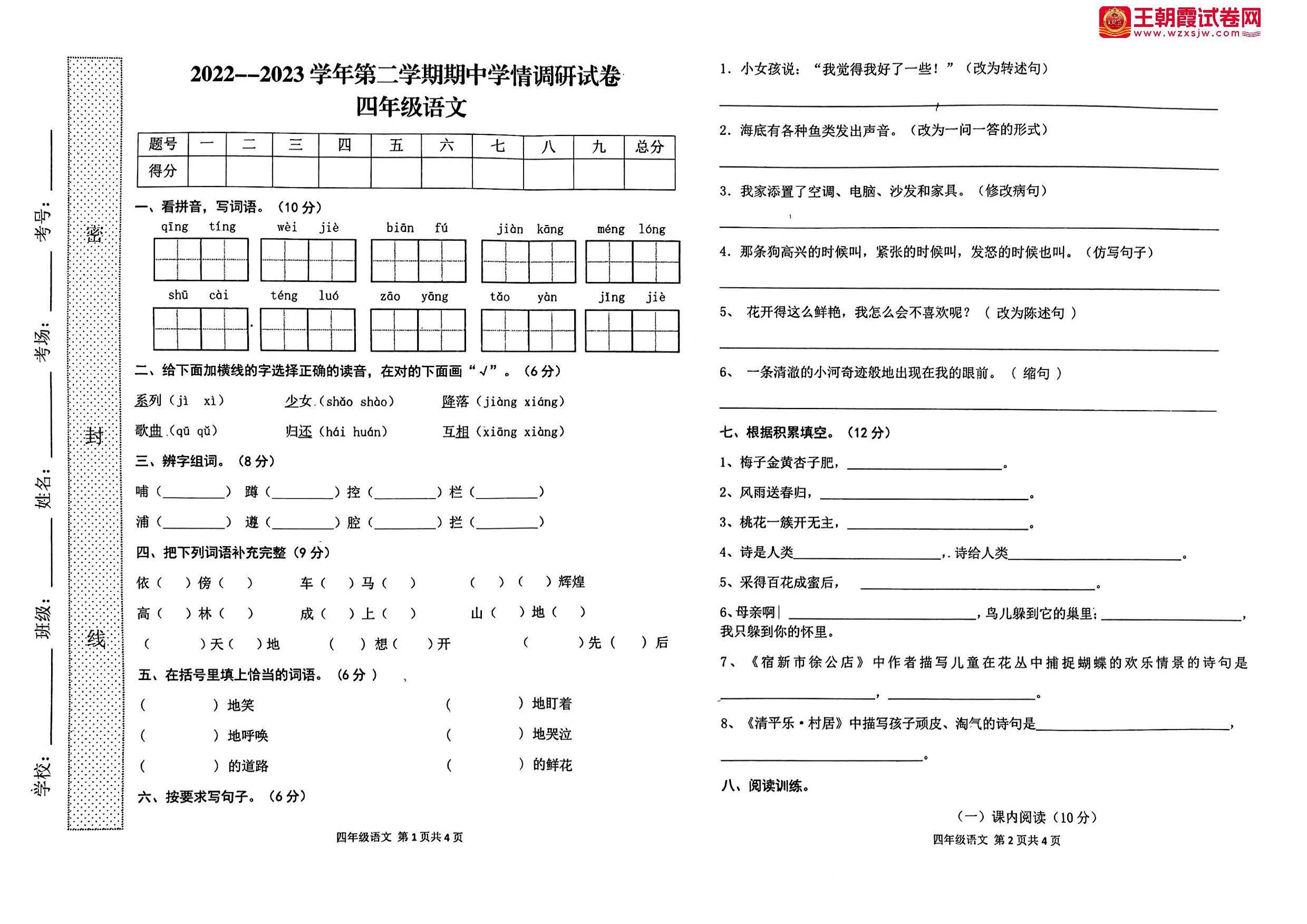 河南省周口市郸城县2022-2023学年第二学期四年级语文期中学情调研试卷(人教版)