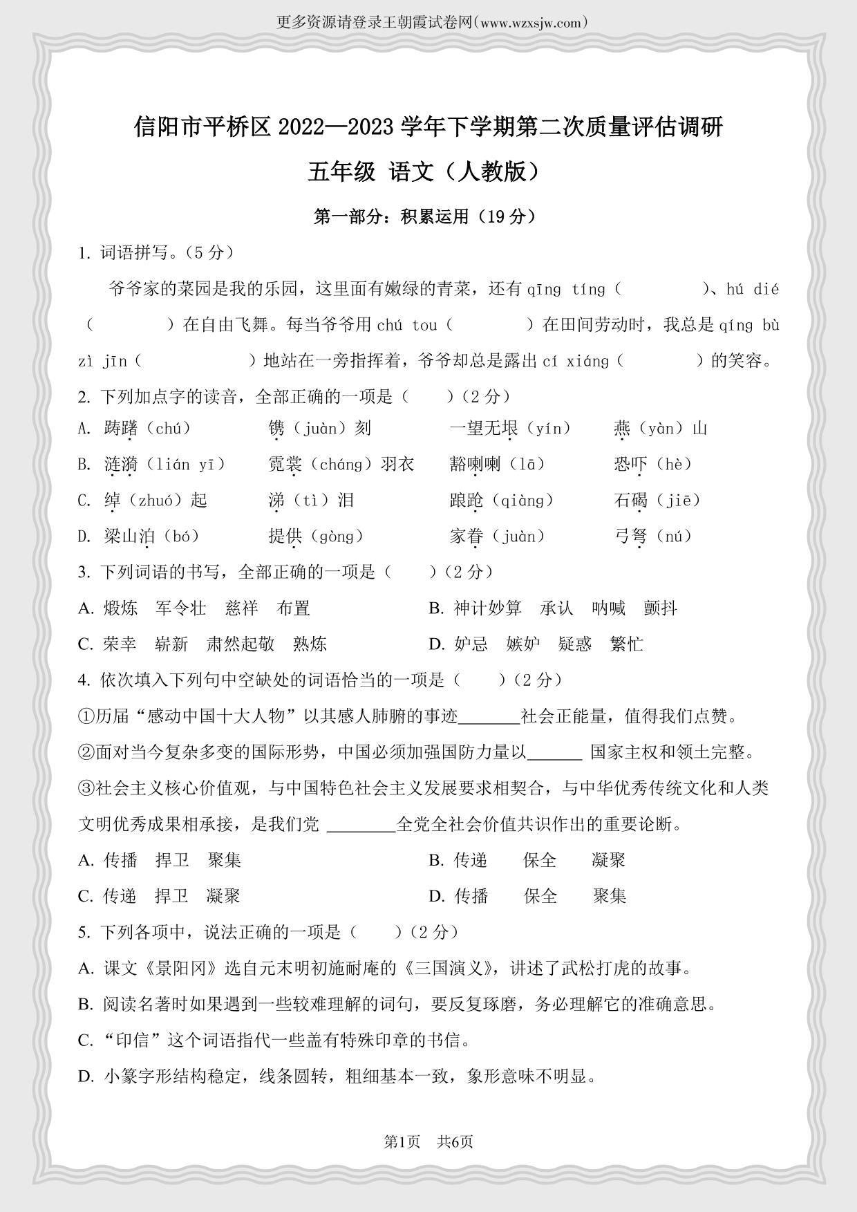 河南省信阳市平桥区2022-2023学年第二学期五年级语文期中质量评估调研(人教版)