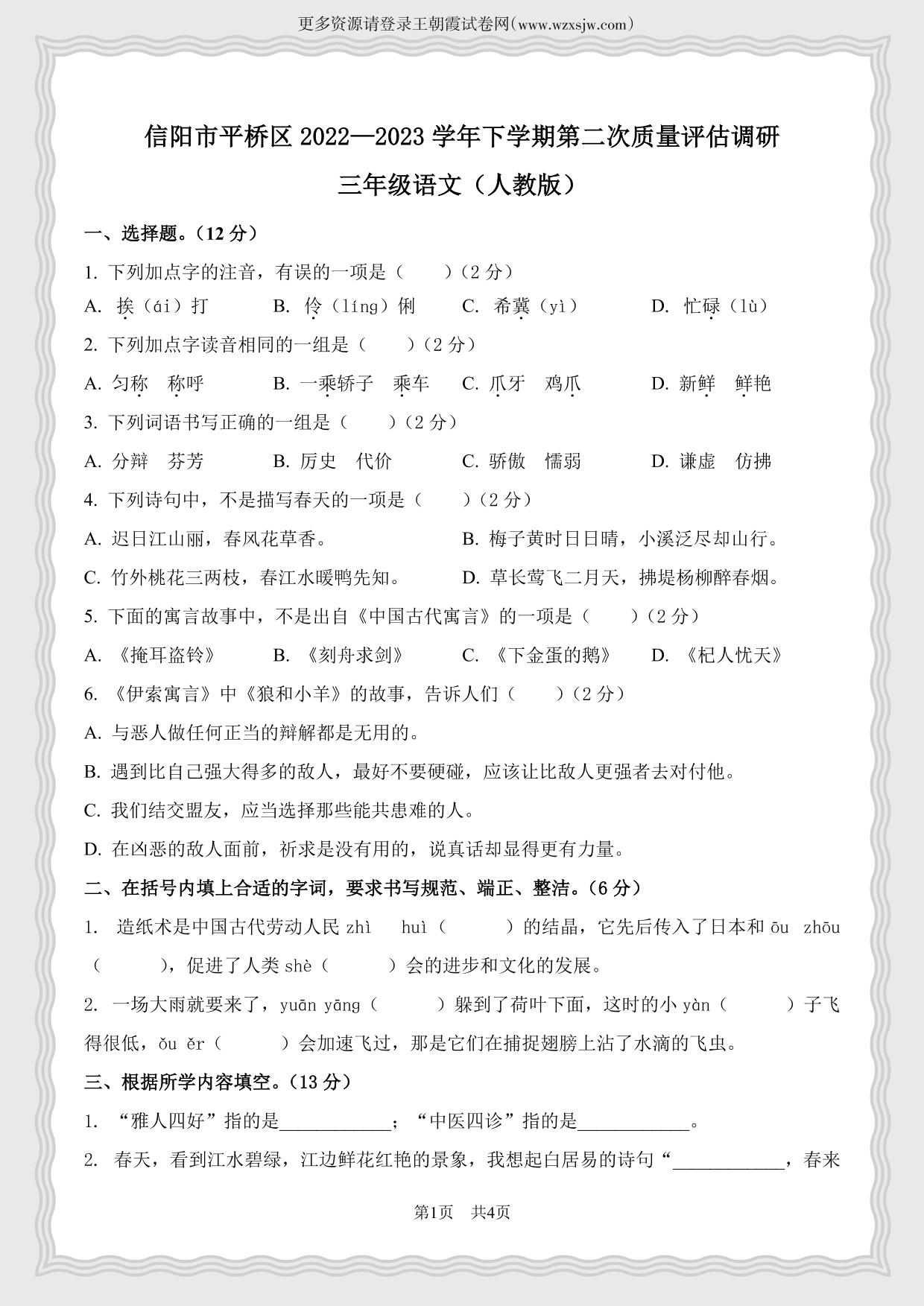 河南省信阳市平桥区2022-2023学年第二学期三年级语文期中质量评估调研(人教版)